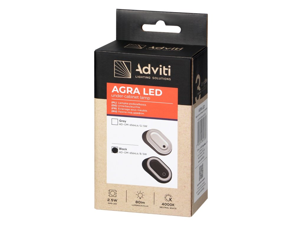 AGRA LED koristi energetski štedljiv LED izvor svjetla snage 2,5 W, koji ima dugi vijek trajanja i nisku potrošnju energije. Široki kut snopa osigurava ravnomjerno raspršivanje svjetla po cijeloj osvijetljenoj površini, pružajući optimalne uvjete za rad ili osvjetljenje prostora ormara. Svjetiljka je namijenjena za upotrebu u suhim prostorijama (IP20).