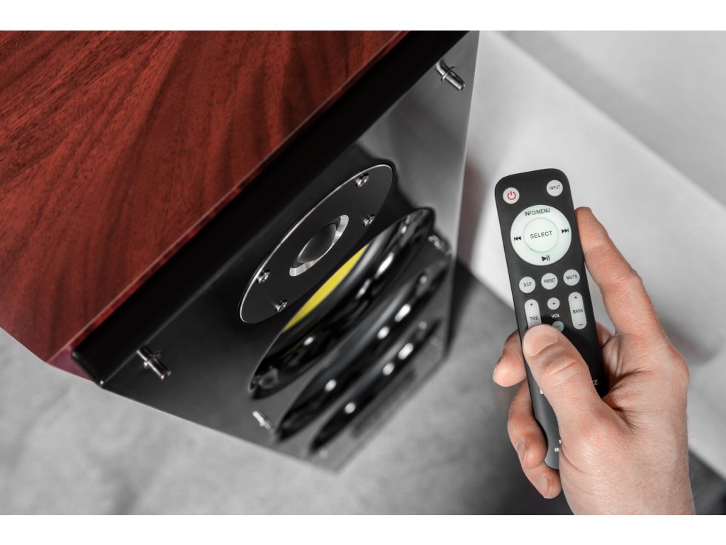 Cijenite li udobnost Set aktivnih zvučnika Kruger&Matz Destiny 2.0 dolazi s daljinskim upravljačem, zahvaljujući kojem možete, na primjer, upravljati glazbom, odabrati izvor reprodukcije ili podesiti bas i visoke tonove. Sve to bez ustajanja s kauča.