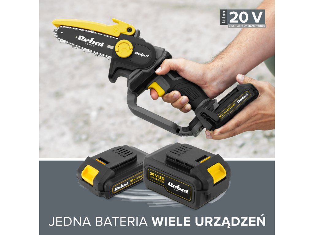 Kao većina uređaja iz serije Rebel Tools, i RB-1034 je pila na baterije.Dovoljno je priključiti odgovarajuću bateriju i uređaj će vam brzo pomoći da se riješite tankih i debelih grana.Ovaj uređaj je kompatibilan s dva modela baterija iz serije Rebel Tools.Ovisno o vašim potrebama, možete kupiti model od 2 Ah (RB-2001) ili 4 Ah (RB-2002) i namjenski punjač.