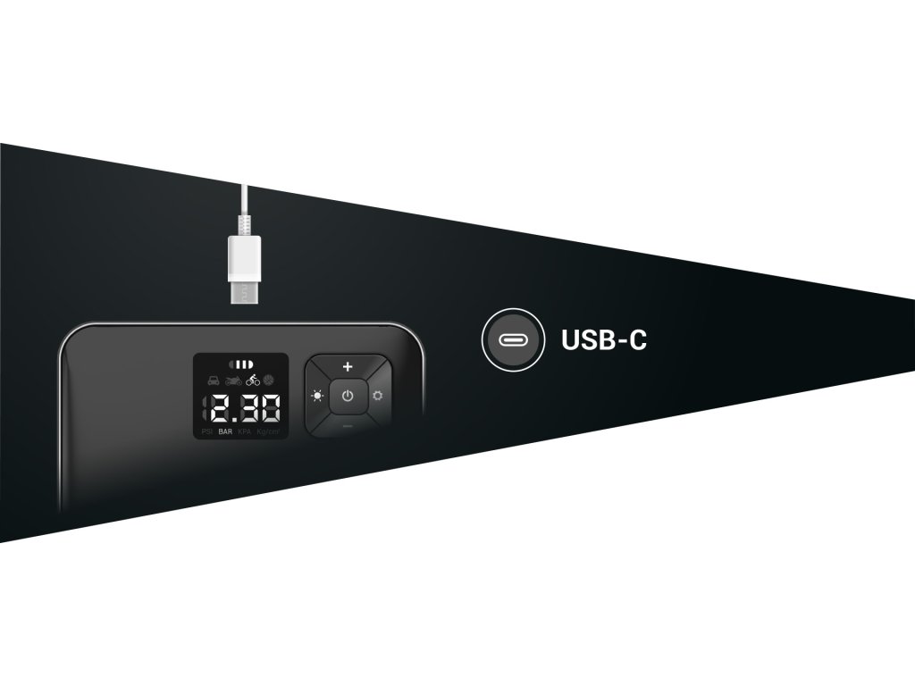 Ugrađena baterija u NAVITEL AIR 15 AL puni se putem USB-C porta. Vrijeme punjenja kompresora je manje od 4 sata. Punjenje se može obaviti pomoću kabela povezanog s uređajem, bilo iz utičnice ili putem adaptera za upaljač u automobilu.