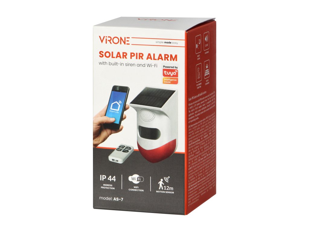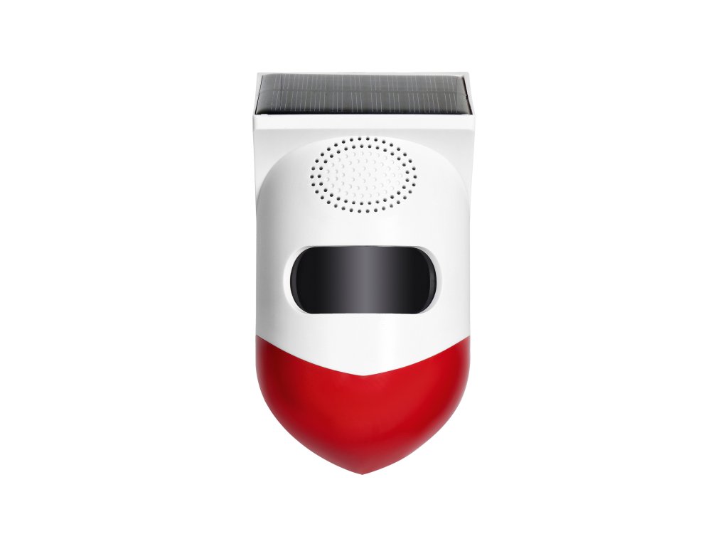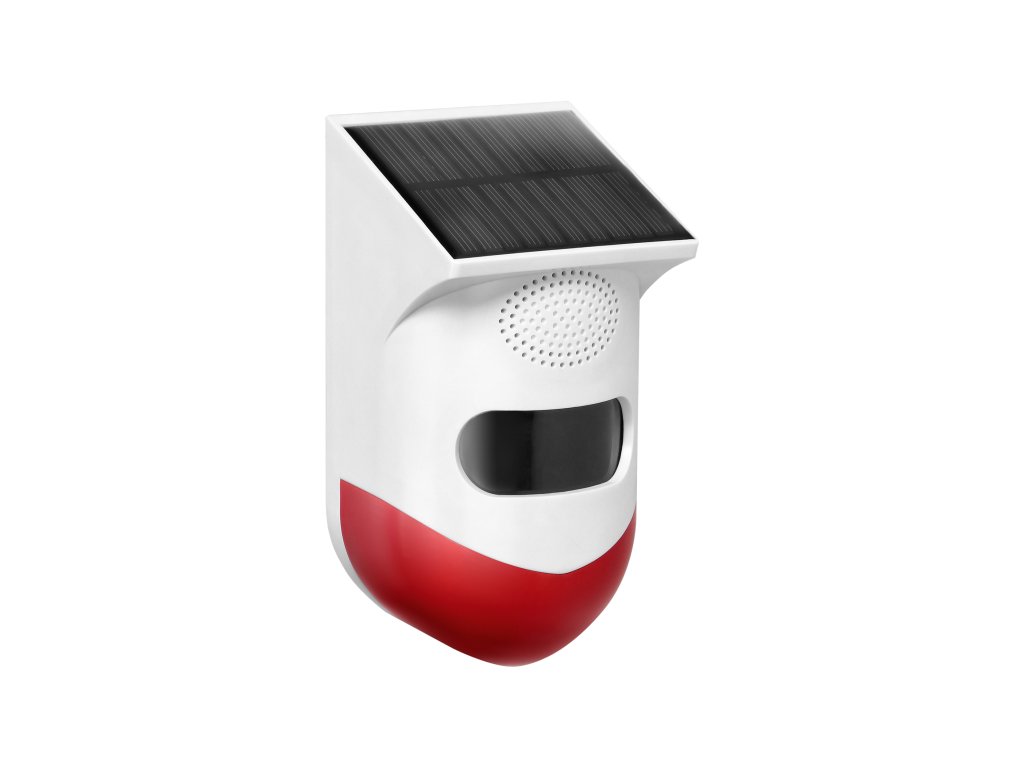 Bežični zvučni i svjetlosni mini alarm, prilagođen za površinsku montažu, dizajniran je za zaštitu domova, ureda, garaža, vrtova i mnogih drugih vanjskih prostora koje želimo zaštititi od upadača. Zahvaljujući klasi zaštite IP44, uređaj je pogodan za vanjsku instalaciju. Ima ugrađeni PIR senzor pokreta s kutom detekcije od 110° i dometom do 9 m. Alarm napaja unutarnja litij-polimerska baterija od 3,7 V koja se puni putem solarnog panela na gornjem dijelu uređaja. Opremljen je glasnom sirenom od 90 dB i alarmnom lampom. Može raditi u jednom od 4 radna načina i aktivirati zvučne i svjetlosne alarme ili samo svjetlosne alarme, u noćnom ili 24-satnom načinu. Postavke alarma uvedene su putem funkcijskih tipki smještenih na stražnjoj strani kućišta ili daljinskim upravljačem koji dolazi kao dio kompleta. Budilica ima ugrađeni Wi-Fi modul i surađuje s aplikacijama Tuya Smart i Smart Life, koje šalju obavijesti o alarmima ili niskom stanju baterije izravno na pametni telefon korisnika. Osim toga, pomoću aplikacije za pametni telefon možete promijeniti radni način, utišati alarm, postaviti trajanje alarma, provjeriti razinu napunjenosti baterije i pregledati povijest događaja.Tehničke specifikacije