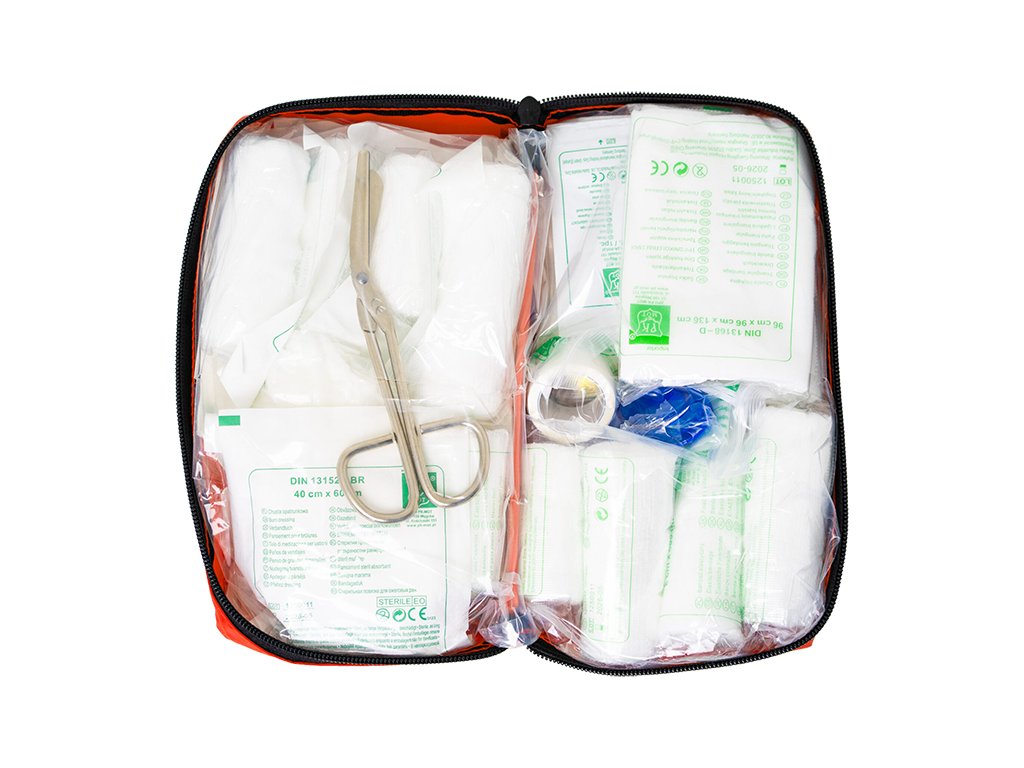 Vodootporna platnena torba.Zatvaranje na čičak za presvlake.PSČ. Medicinske potrepštine označene oznakom CE.Pribor za prvu pomoć zadovoljava zahtjeve normi Europske unije.Rok trajanja sterilnih proizvoda je 5 godina.Vrsta pakiranja: folijska vrećica / karton.Dostupne boje torbica: narančasta, crvena, akvamarin (mješavina boja - izbor nije moguć)Dimenzije: 22 x 14 x 8 cm Oprema: FLASTER NA KOLUTU 5 M X 2,5 CM – 1 KOM.SET ZA ZAVOJ - 14 STAVKI.ELASTIČNI ZAVOJ 4 M X 6 CM - 2 KOMELASTIČNI ZAVOJ 4 M X 8 CM - 3 KOMJEDNOKRATNE VINILNE RUKAVICE - 4 KOM (2 PARA)JASTUČIĆ 60 X 80 CM - 1 KOMJASTUČIĆ SA ZAVOJEM 60 X 40 CM - 1 KOMZAVOJ S KOMPRESOM (INDIVIDUALNI OBLAGANJE) 6 X 8 CM - 1 KOM.ZAVOJ S KOMPRESOM (INDIVIDUALNI OBLAGANJE) 8 X 10 CM - 2 KOMZAVOJ S KOMPRESOM (INDIVIDUALNI OBLAGANJE) 10 X 12 CM - 1 KOM.KOMPRES ZA RANE 10 X 10 CM – 6 KOM/3 PAK.TROKUTNA MARAMA - 2 KOMTOPLINSKI POKRIVAČ - 1 KOM.ŠKARE - 1 kom.VLAŽNE MARAMICE - 2 KOMUPUTE ZA PRVU POMOĆ - 1 kom Uložak za umjetno disanje - 1 kom