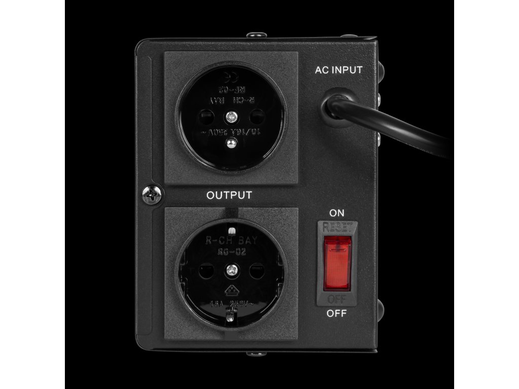 Ulaz: Raspon napona 150 - 270 V AC Ulaz: Frekvencija 50/60 Hz Izlaz: Napon 230 V Izlaz: Frekvencija 50/60 Hz Izlaz: Točnost ±8% Izlazni napon: Jedna faza Toroidalni transformator C.R.G.O. Učinkovitost: 98% Zaštite: od prevelikog i premalog napona, preopterećenja, pregrijavanja, kratkog spoja Kašnjenje: Bez kašnjenja / kašnjenje (180/6 sekundi) Radna temperatura: 0~40°C Relativna vlažnost: 10%~90% Skladišna temperatura: -15~45°C ---------- Težina: 2,75 kg Dimenzije: 117 x 197 x 90 mmUlaz: Raspon napona 150 - 270 V AC