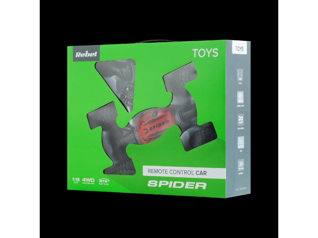 Iskusite uzbuđenje utrkivanja bez ograničenja. S brzinom do 20 km/h se Rebel Spider s pogonom na dva kotača snalazi u bilo kojem terenu. Doseg daljinskog upravljanja do 40 metara u kombinaciji s funkcionalnošću vozila znači da, kada vozilo udari u prepreku i odskoči, ne morate sami intervenirati i unatrag voziti, već samo nastaviti igru! Kada se krov vozila u off-road načinu proširi, dovoljno je pritisnuti gumb za deformaciju i konstrukcija vozila će se proširiti, što vam omogućuje nastavak vožnje.