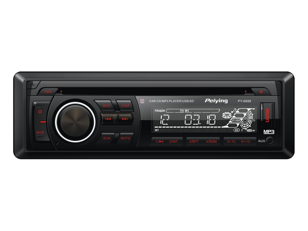 Auto radio 1DIN odlično je predstavljeno radio koje vam zahvaljujući USB priključku omogućuje uživanje u čistom i jasnom zvuku vaše omiljene glazbe pohranjene na CD-ima, SD/MMC memorijskim karticama i pen pogonima. Radio PY6688 također je opremljeno Aux priključkom i linijskim izlazom 2xRCA. Na bijelo osvijetljenom zaslonu prikazuju se jasne informacije o reproduciranoj snimci, a zahvaljujući crveno osvijetljenim funkcijskim tipkama, upravljanje radiom je jednostavno i ugodno.