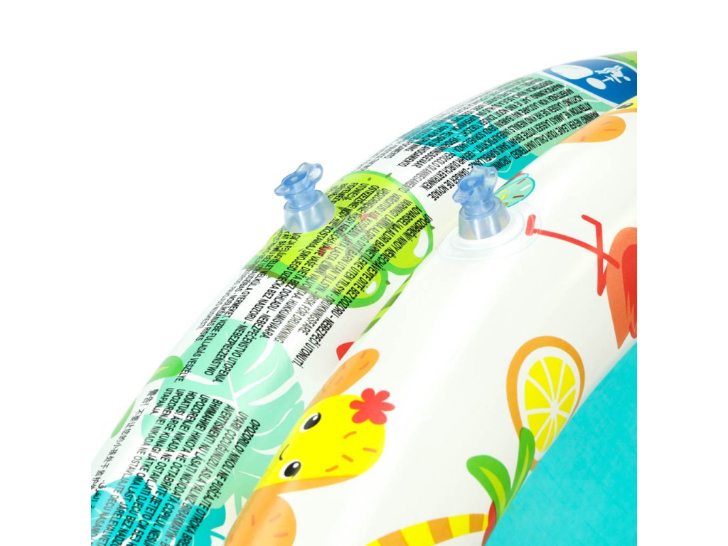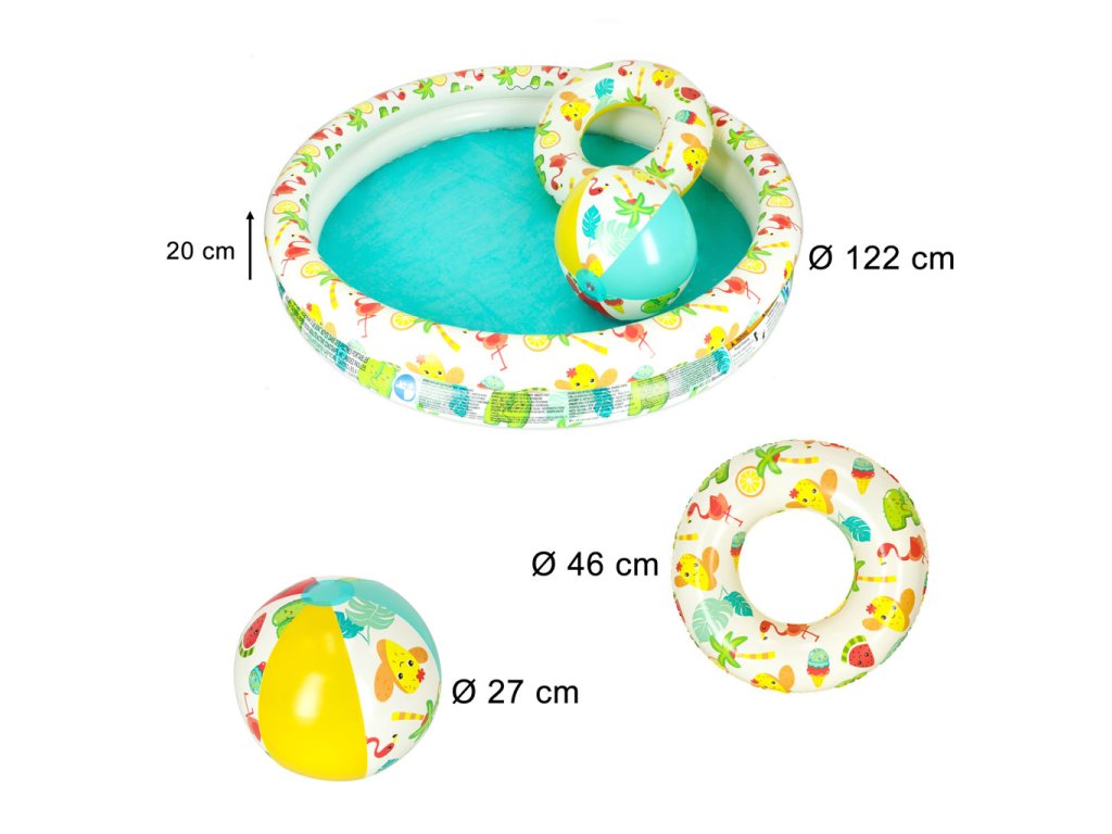U okrugli napuhani bazen - dječji bazenima promjera 122 cm i visine 20 cm mogu se bez problema smjestiti 2 djece, koji se mogu igrati zajedno. Bazen ima 2 zasebne zračne komore u obliku prstena, koje su dodatno zaštićene protiv ispuštanja zraka. Izrađen je od ispitivanog, mekog i izdržljivog vinilnog materijala. Zahvaljujući malim dimenzijama i težini možete ga ponijeti bilo gdje, na plažu, na travu ili na odmor. Prekrasne pomorske boje pružit će puno zabave i najmanjoj djeci.