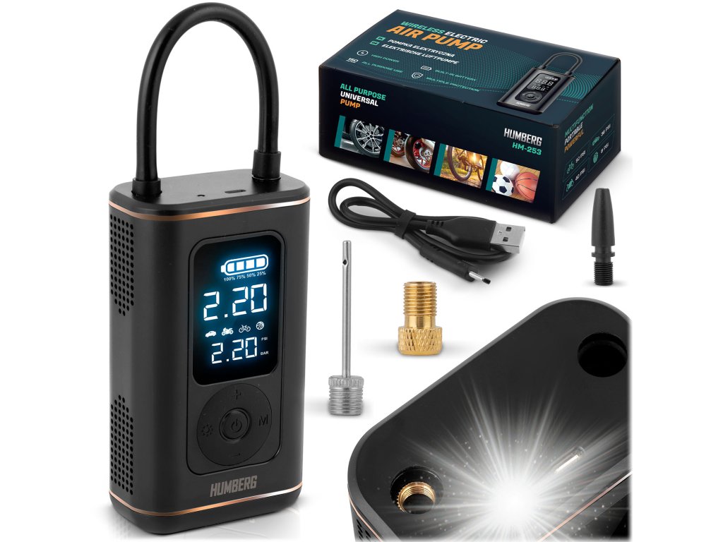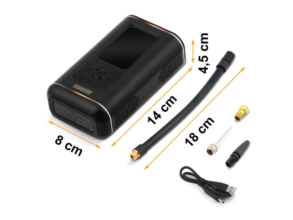 - Set: zračna cijev, igla za lopte, presta nastavak, nastavak za pumpanje, USB-C kabel, kućište
