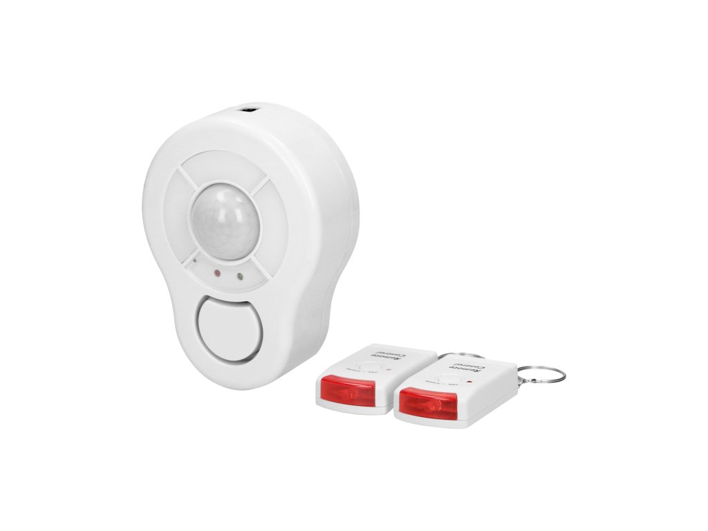 Prijenosni infracrveni alarmni uređaj s ugrađenom sirenom i senzorom pokreta, koji se može upravljati pomoću jedinice daljinskog upravljača. Ovaj minijaturni alarm detektira pokret s udaljenosti od 5 metara u rasponu od 360°. Glasnoća sirene je 85 dB.Tehnička specifikacija