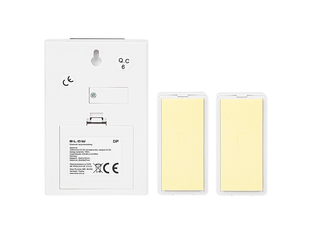 - Maksimalni domet predajnika: 100 metaraów- Frekvencija: 433 MHz- Broj unaprijed definiranih zvona: 3- Mogućnosti kodiranja: prema korisniku- Optički signal: 1 LED- Napajanje: 3xAA ili 5V DC adapter (prijemnik) - nije uključen, CR2032 (predajnik) - uključen je - Dimenzije: Predajnik - 78x39x22 mm | prijemnik - 118x78x27 mm