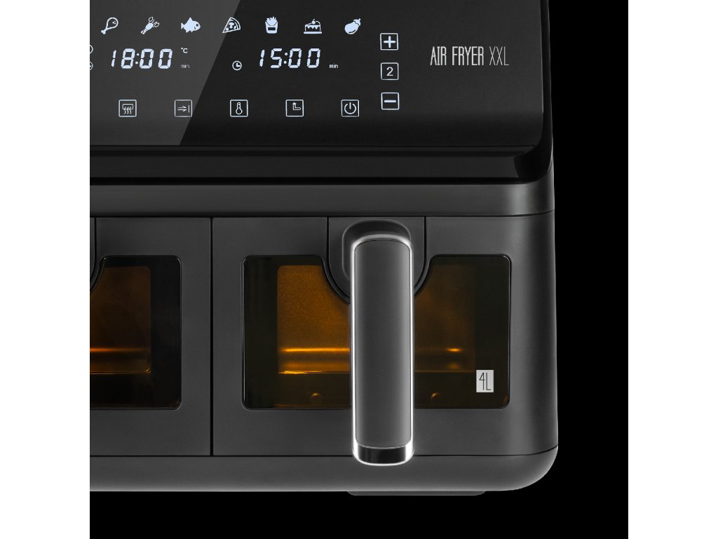Dva koša, dva jela Više ne morate birati između krumpirića i povrća. Zahvaljujući dvjema neovisnim zonama kuhanja, možete postaviti različitu temperaturu i vrijeme za svako jelo. Želite pripremiti meso u jednoj komori, a krumpiriće u drugoj Nema problema – sve će biti gotovo u isto vrijeme. To je kao dva uređaja u jednom – udobno, brzo i bez nepotrebnih komplikacija.