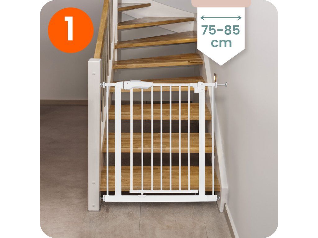 Zahvaljujući mogućnosti proširenja i sustavu montaže, zabrana za stepenice može se prilagoditi dovratnicima s dimenzijama od 75 cm do 105 cm.
