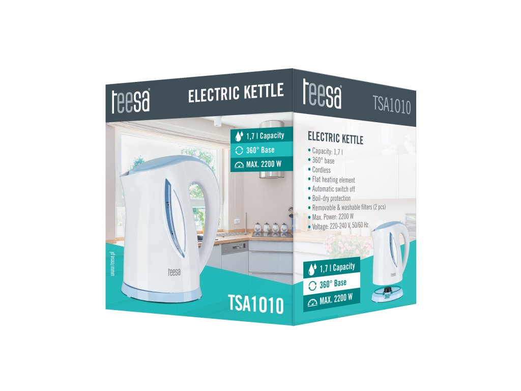 TSA1010 je praktičan bežični čajnik s kapacitetom 1,7 litre. Ovaj čajnik s bijelim tijelom i plavim obrubom savršeno će se uklopiti u interijer svake kuhinje, a njegov visokokvalitetni materijal osigurava dugotrajnost. Čajnik je opremljen ugrađenim ravnim grijačem koji omogućava brzo kuhanje vode i olakšava održavanje uređaja čistim. Proizvod ima zaštitu protiv uključivanja bez vode i automatsko isključivanje kako bi se spriječilo pregrijavanje. Rotirajuća baza omogućava postavljanje u bilo kojem položaju, a uklonjivi filtar štiti od taloženja kamenca koji nastaje tijekom kuhanja vode.