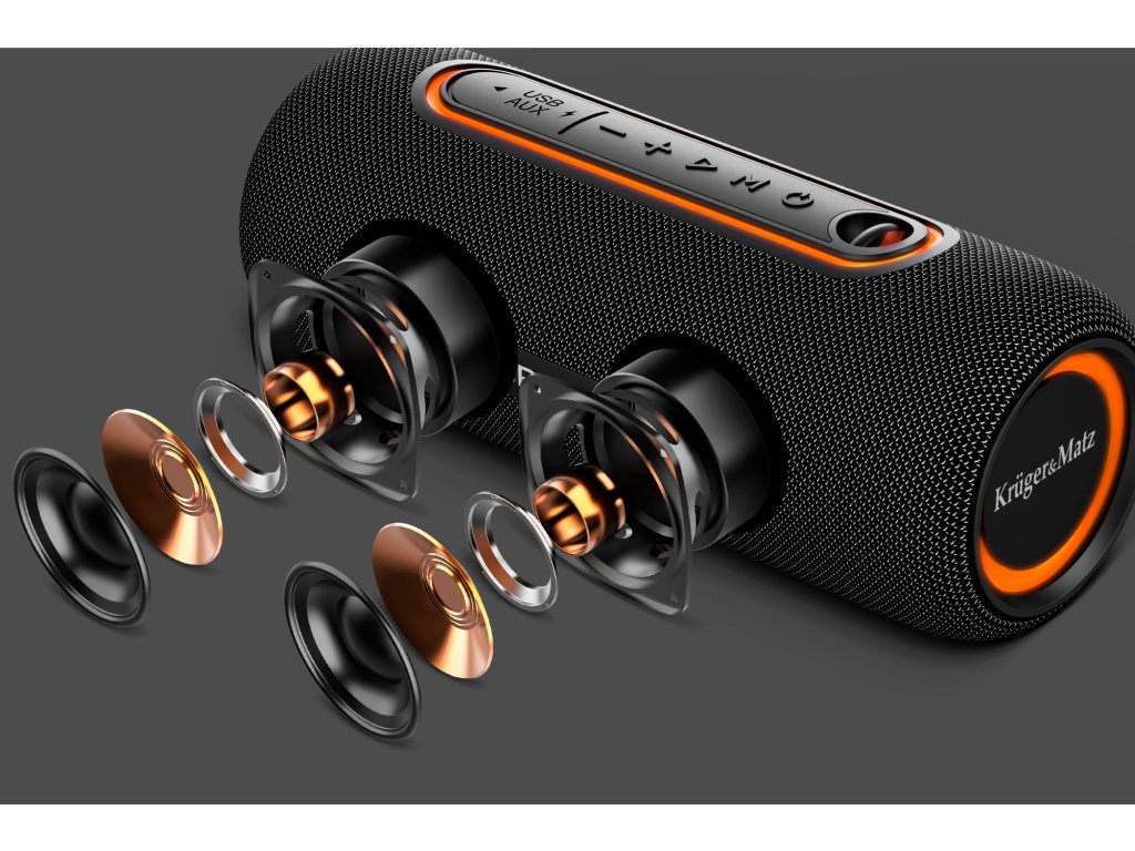 Praktično upravljanje Bluetooth Street zvučnikom osigurava upravljačka ploča s gumbima na kućištu za promjenu izvora reprodukcije, razine glasnoće ili prikaza. Štoviše, ako imate zbirku omiljene glazbe na flash disku ili prijenosnom playeru, možete koristiti USB priključak ili AUX konektor za njezinu reprodukciju.