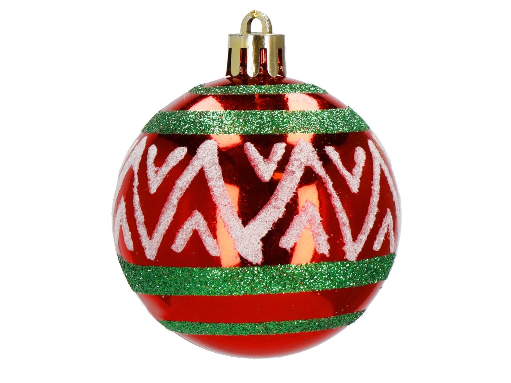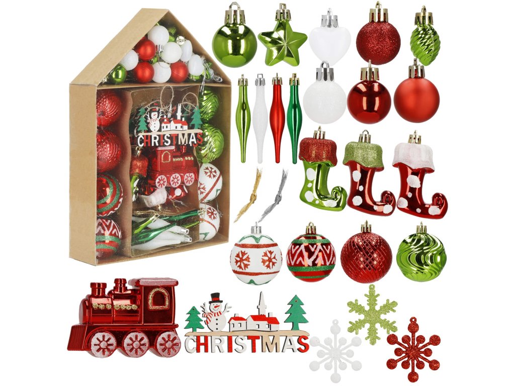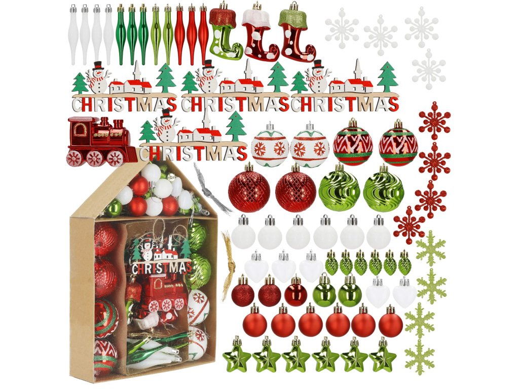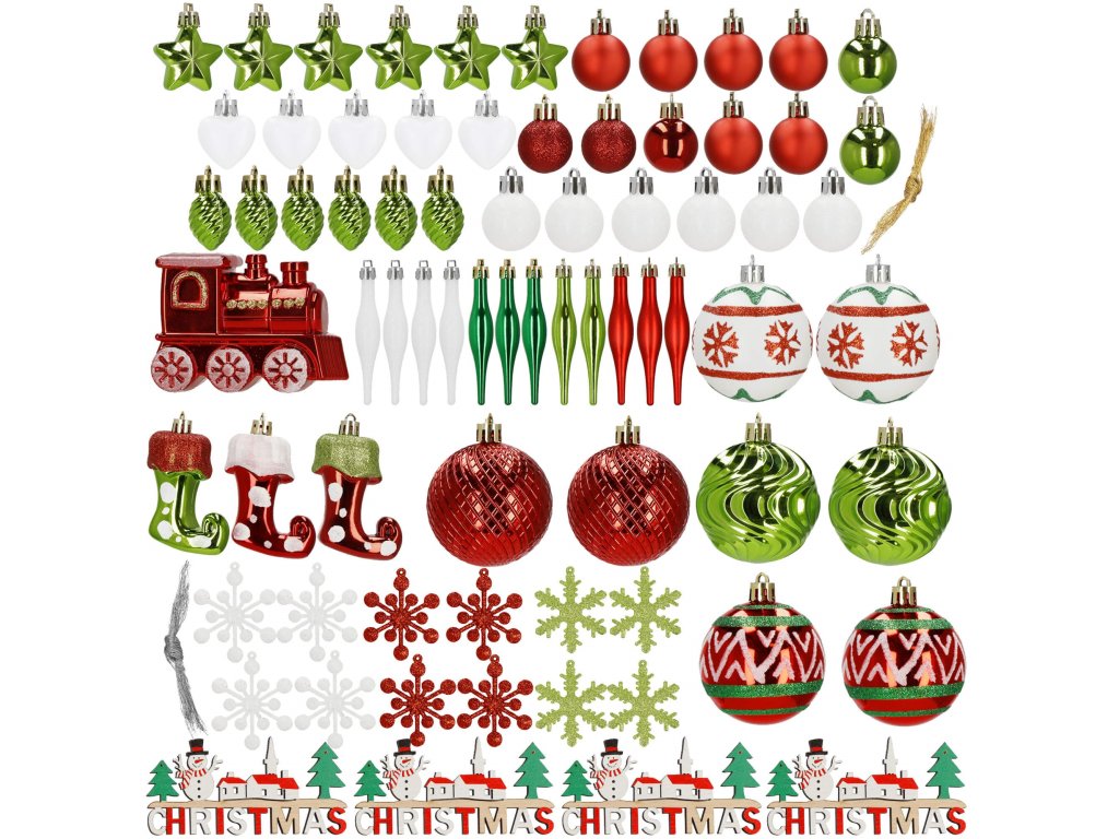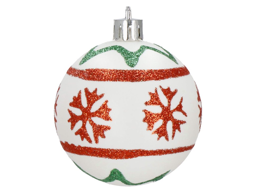 - 4 x crvena pahulja - 6 cm 4 x bijela snježna pahulja - 6 cm 2 x zelena mala kuglica - 4 x 2,7 cm 6 x crvena mat ukras - 4 x 2,9 cm 1 x crvena kuglica - 4 x 2,7 cm 2 x kuglica s crvenim šljokicama - 4 x 2,7 cm
