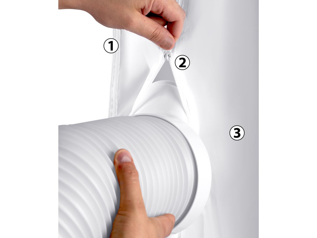 - Patentni zatvarač s povlačenjem — omogućuje jednostavno prilagodbu položaja cijevi različitim visinama prozora. Optimalno brtvljenje, povećava učinkovitost hlađenja i minimalizira gubitak energije.