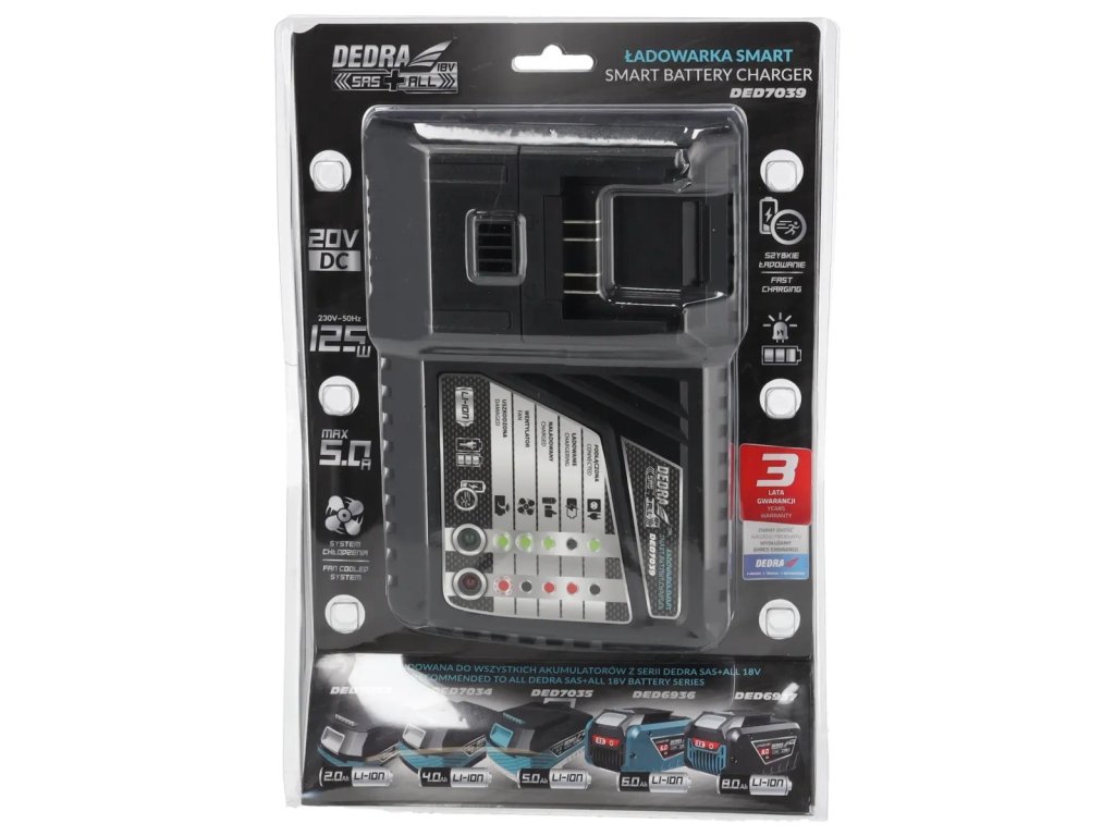 Ovaj proizvod namijenjen je za punjenje baterija serije SAS+ALL (DED7032, DED7034, DED7035, DED6936, DED6937). Baterija kapaciteta 2,0 Ah puni se za 30 minuta, a baterija kapaciteta 4,0 Ah za 1 sat. Najsnažnija baterija od 5Ah može se napuniti za 1 sat i 10 minuta. Punjač je opremljen ventilatorom koji hladi bateriju tijekom punjenja i štiti je od pregrijavanja. Osim toga, punjač je opremljen informacijskim sustavom LED baterije i ima dijagnostičku funkciju.