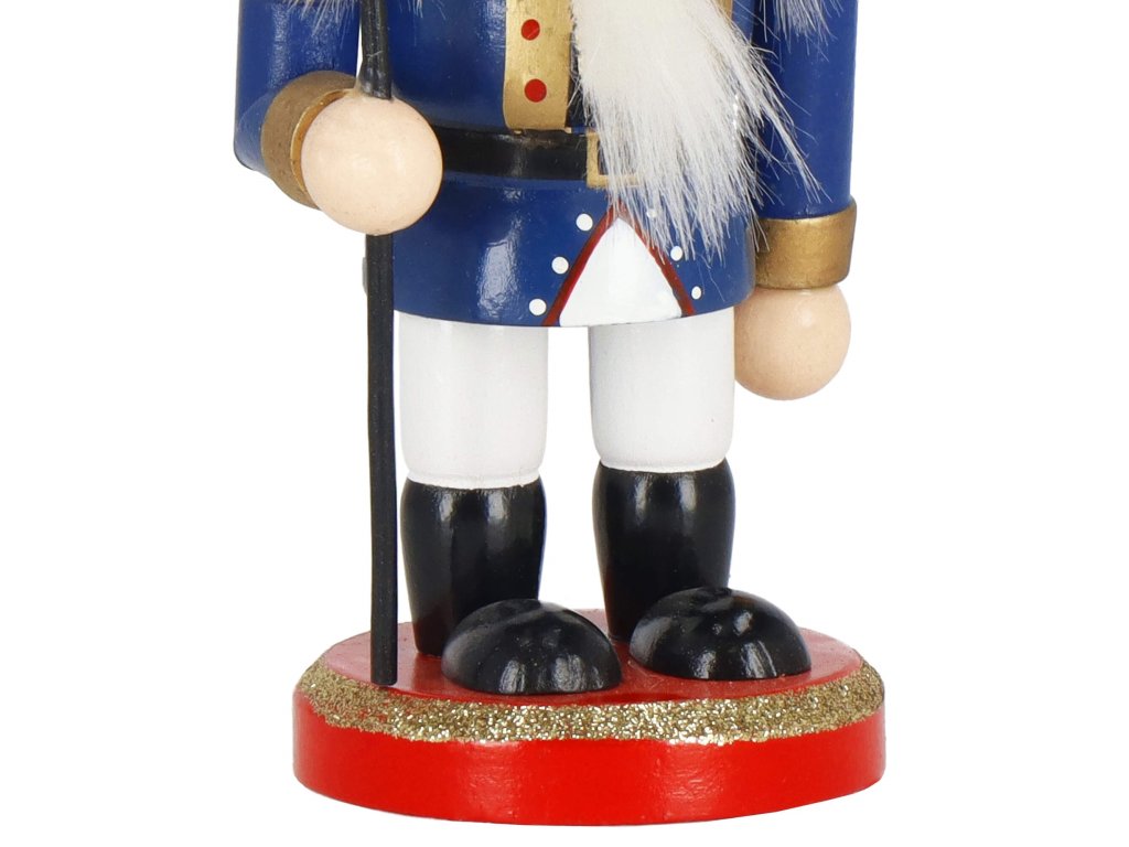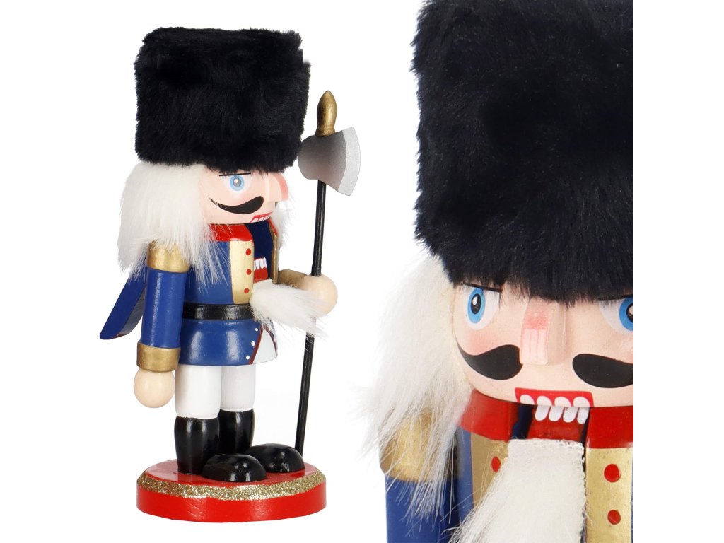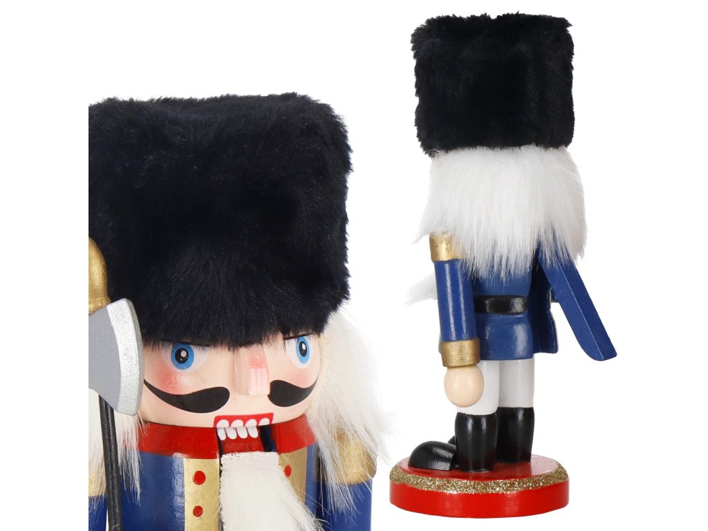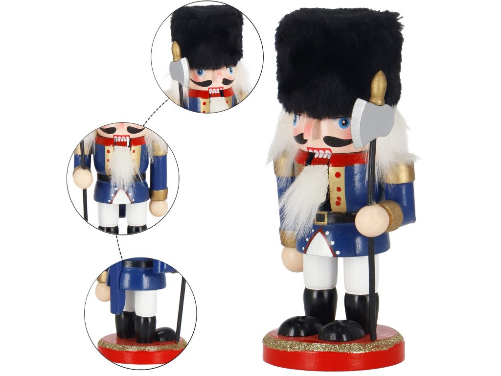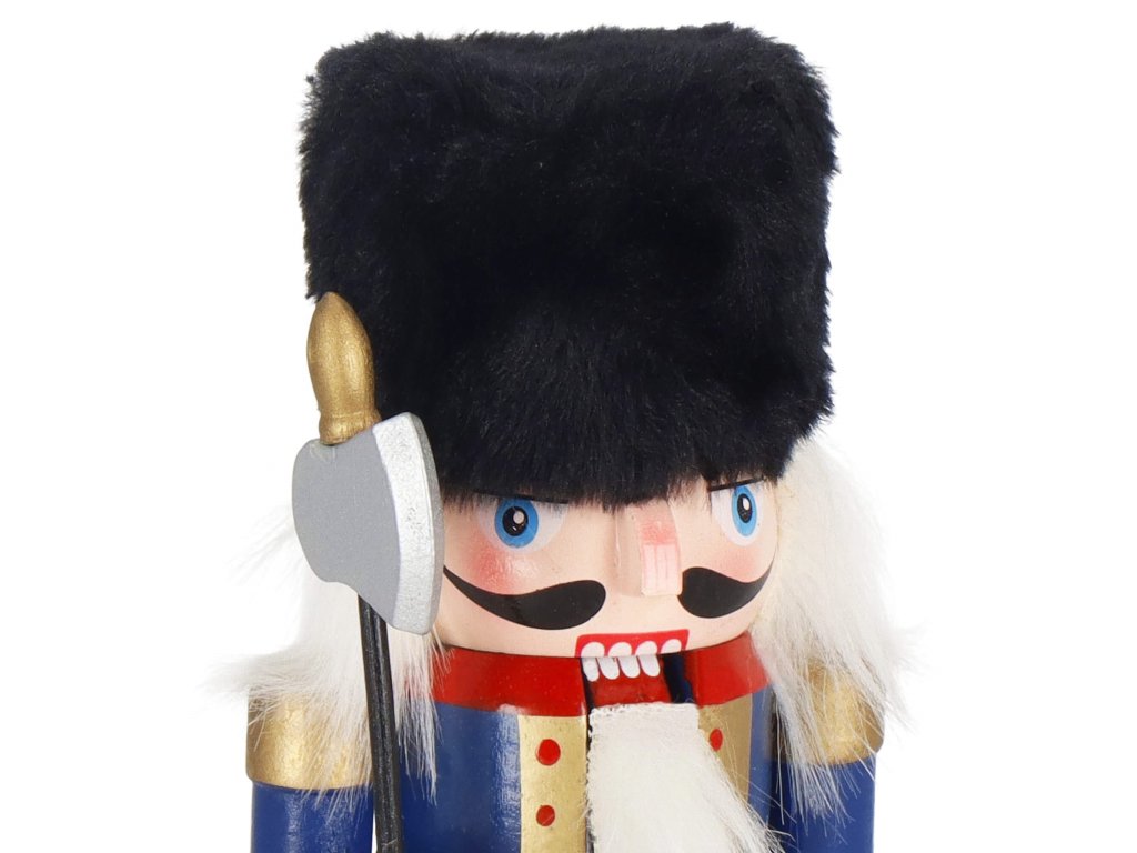 - Elementi konstrukcije: kapa s crnim krznenim obrubom, tamnoplava odjeća, crne cipele, lice s očima i brkovima, istaknut nos, sijeda kosa i brada, otvor za orahe u ustima otvaran podizanjem poluge straga, sjekira u ruci