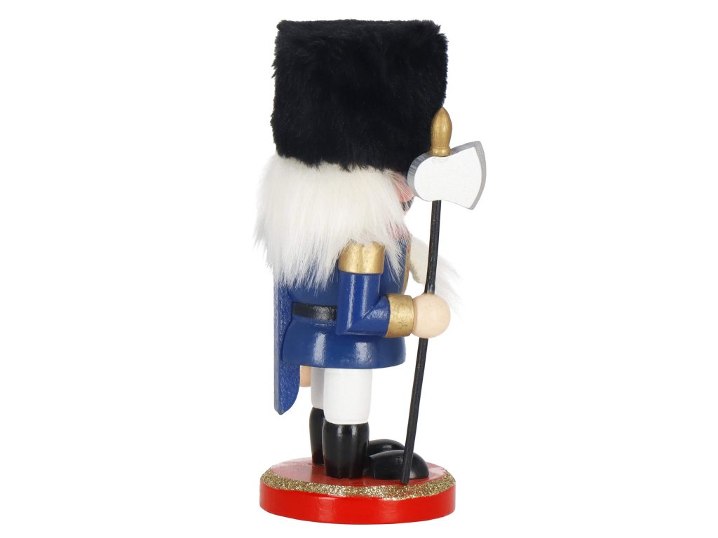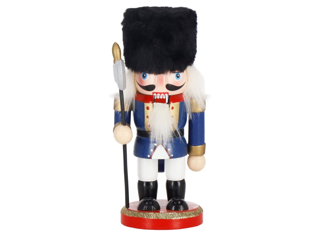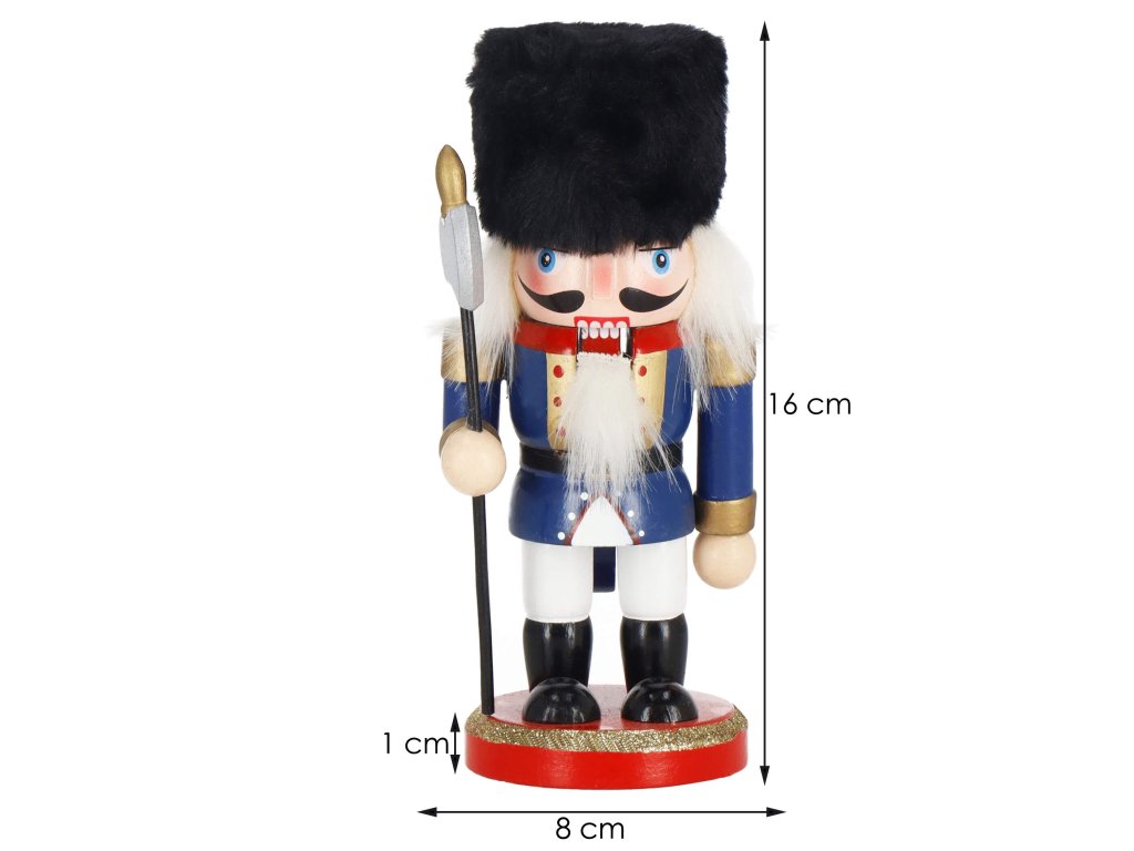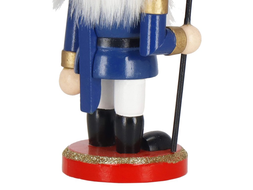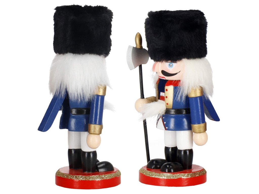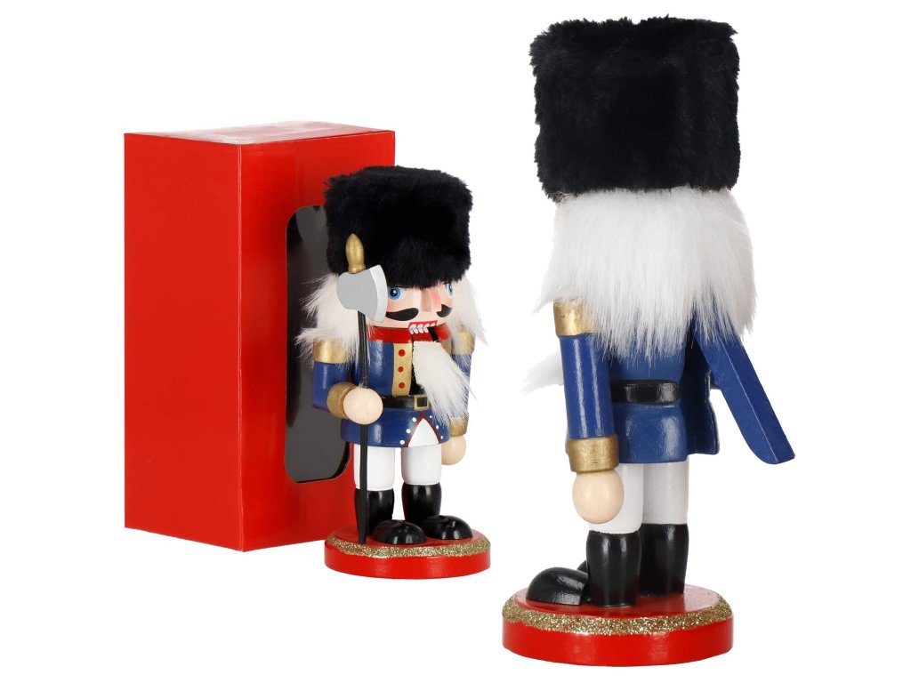 - Elementi konstrukcije: kapa s crnim krznenim obrubom, tamnoplava odjeća, crne cipele, lice s očima i brkovima, istaknut nos, sijeda kosa i brada, otvor za orahe u ustima otvaran podizanjem poluge straga, sjekira u ruci