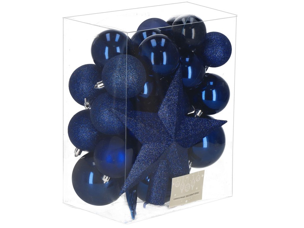 - 4x sjajna kugla - 5 cm3x svjetlucava kugla - 5 cm6x mat kugla - 6 cm6x svjetlucava kugla - 6 cm6x sjajna kugla - 6 cm4x sjajna kugla - 8 cm3x sjajne ledenice - 13 cm1x zvijezda (vrh za drvce) - 19 x 19 cm / promjer otvora: 2 cm