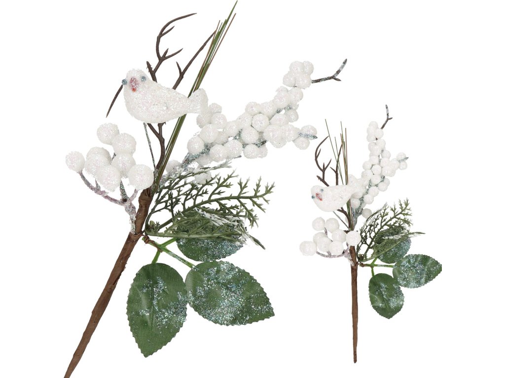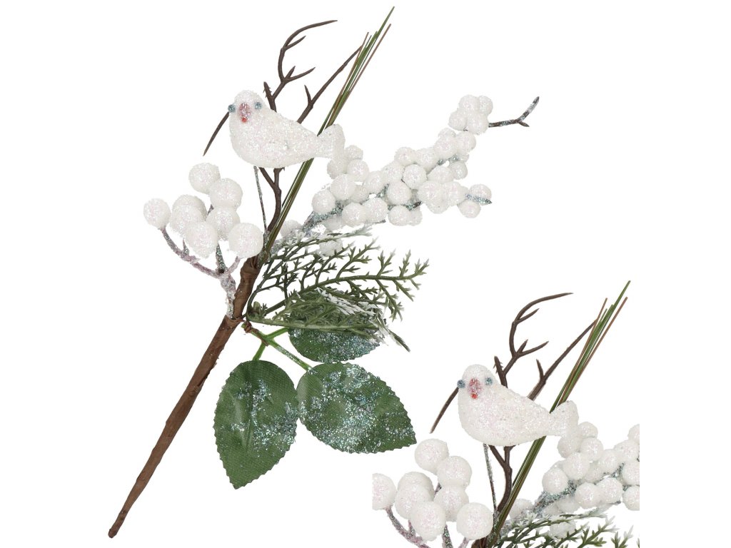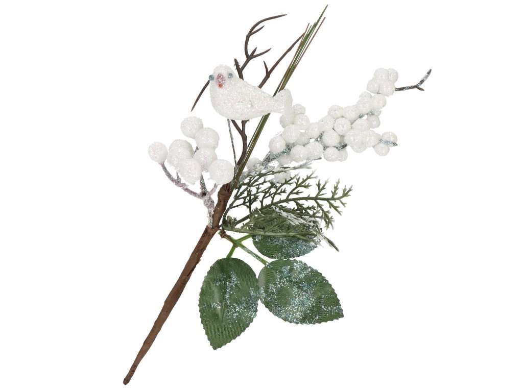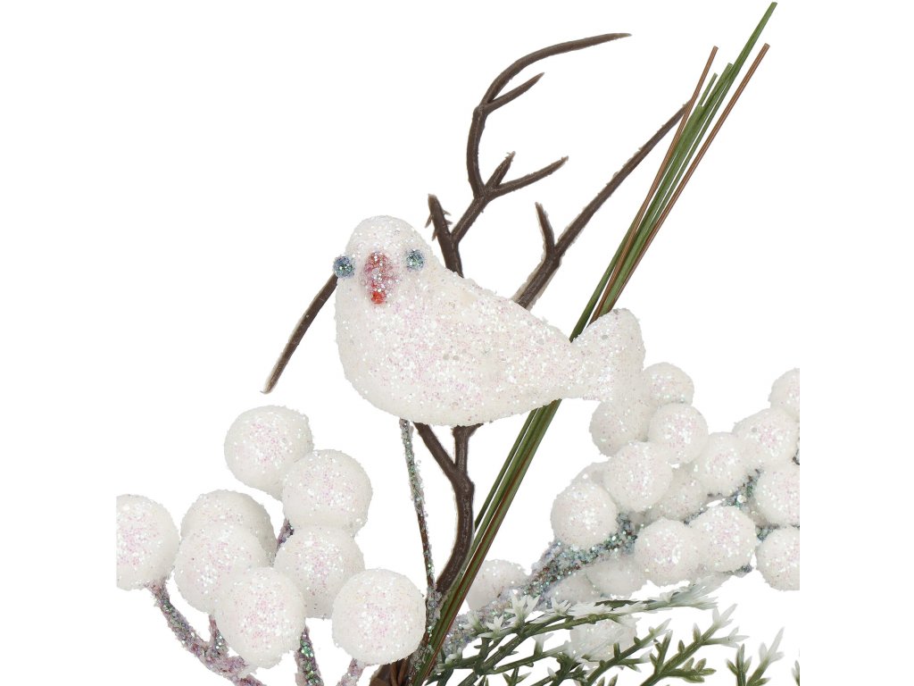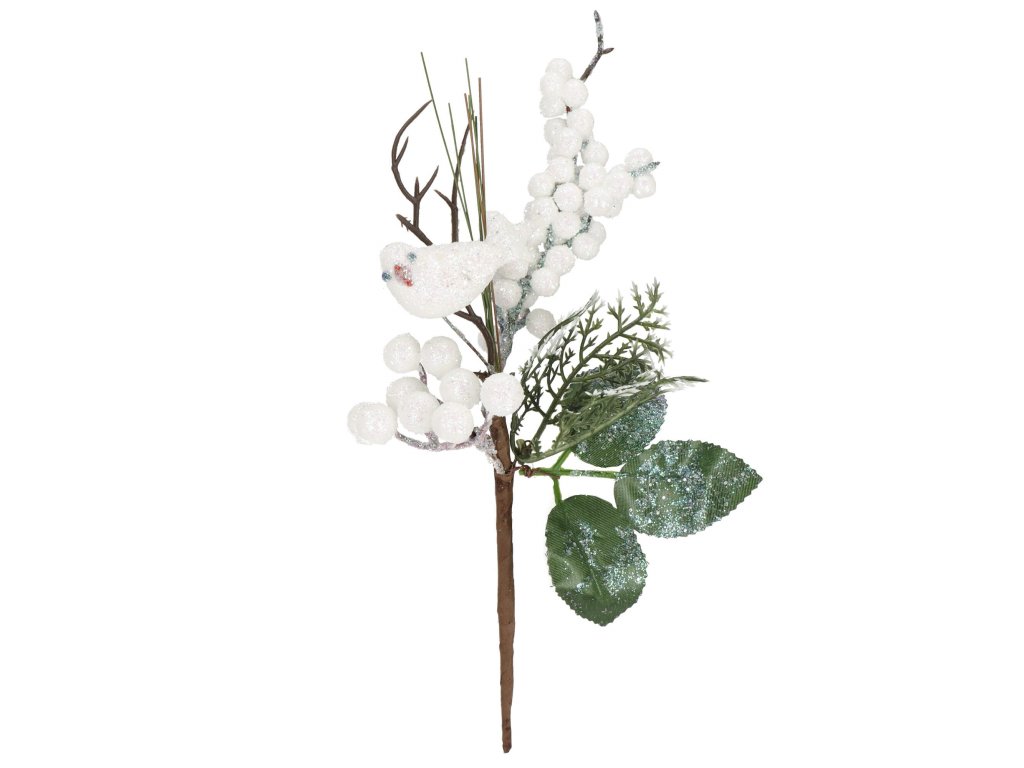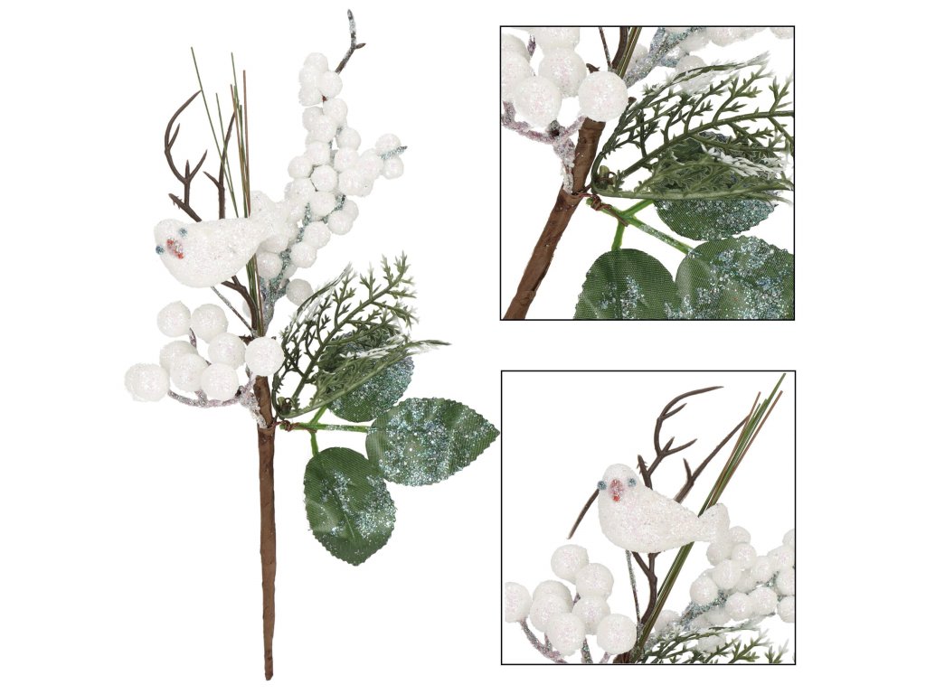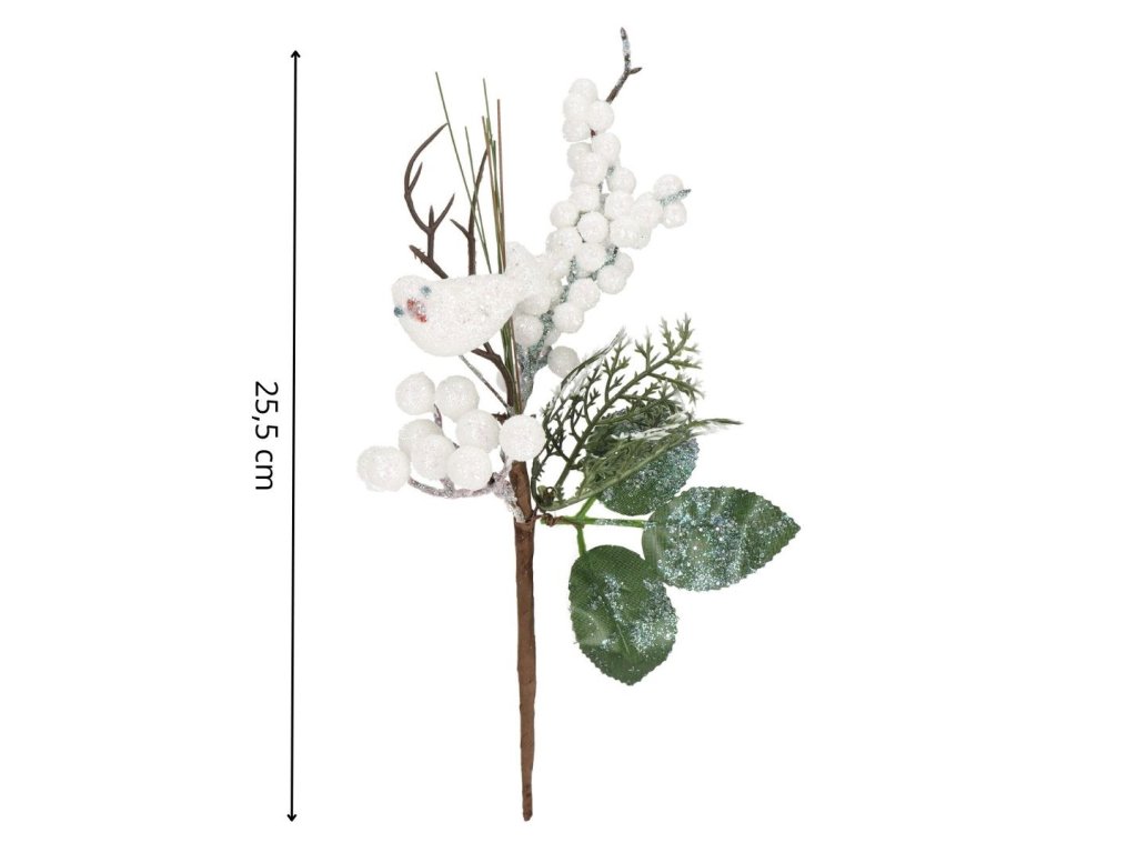 - Grančica sadrži: bijele kuglice (oskoruša), umjetno lišće i grančice, sjajna ptičica