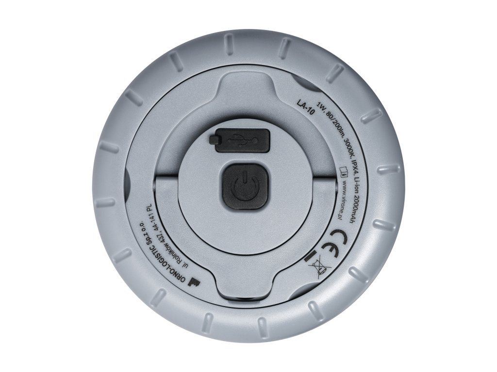 Lampa je izrađena od visokokvalitetne plastike. Siva boja kućišta i bijeli abažur lampe uklapaju se u bilo koje okruženje. Stupanj zaštite IPX4 osigurava otpornost na vlagu, čineći je idealnim izborom za unutarnju i vanjsku upotrebu. Dimenzije: 90 mm, dubina 49 mm. Duljina napojnog kabela je 0,5 m
