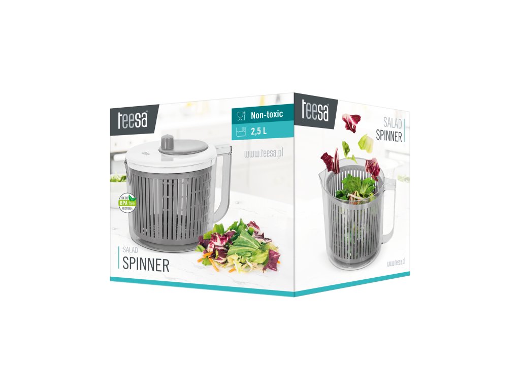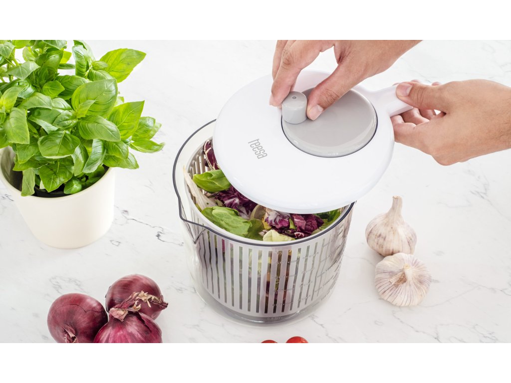 Centrifuga za salatu Teesa s kapacitetom od 2,5 litre dodatak je koji će vam biti od koristi u kuhinji, ali i na kampiranju ili na imanju. Jednostavna je za upotrebu i omogućava vam brzo ocjeđivanje salate, vlasca ili peršina, čime pojednostavljuje proces pripreme omiljenih jela za cijelu obitelj.