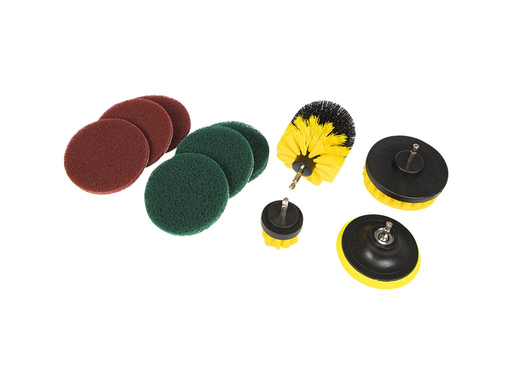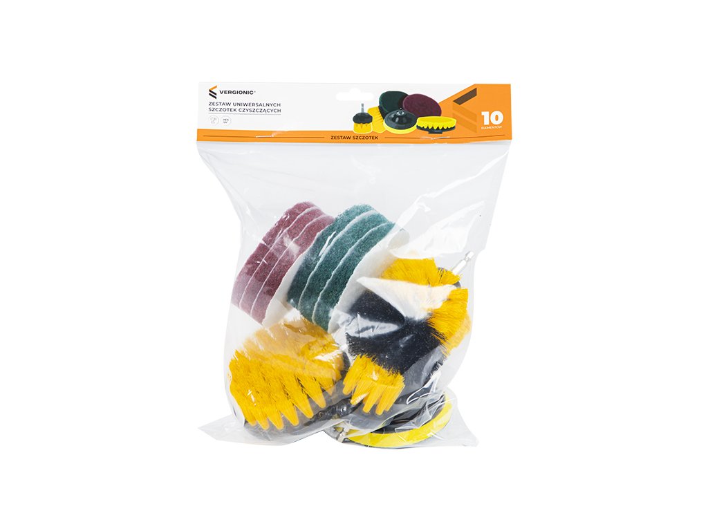 Set sadrži 10 elemenata - 3 četke različitih oblika i širina, 6 polirnih diskova s 2 različite grubosti te disk za diskove s poklopcem na čičak. Četke su opremljene s 1/4" HEX drškom, kompatibilne su s bušilicama i odvijačima. Četke su izrađene od visokokvalitetnog materijala - PP srednje tvrdoće, što jamči izdržljivost i učinkovitost i sprječava širenje vlakana tijekom rada. Četke su kompatibilne s kemijskim sredstvima za čišćenje.