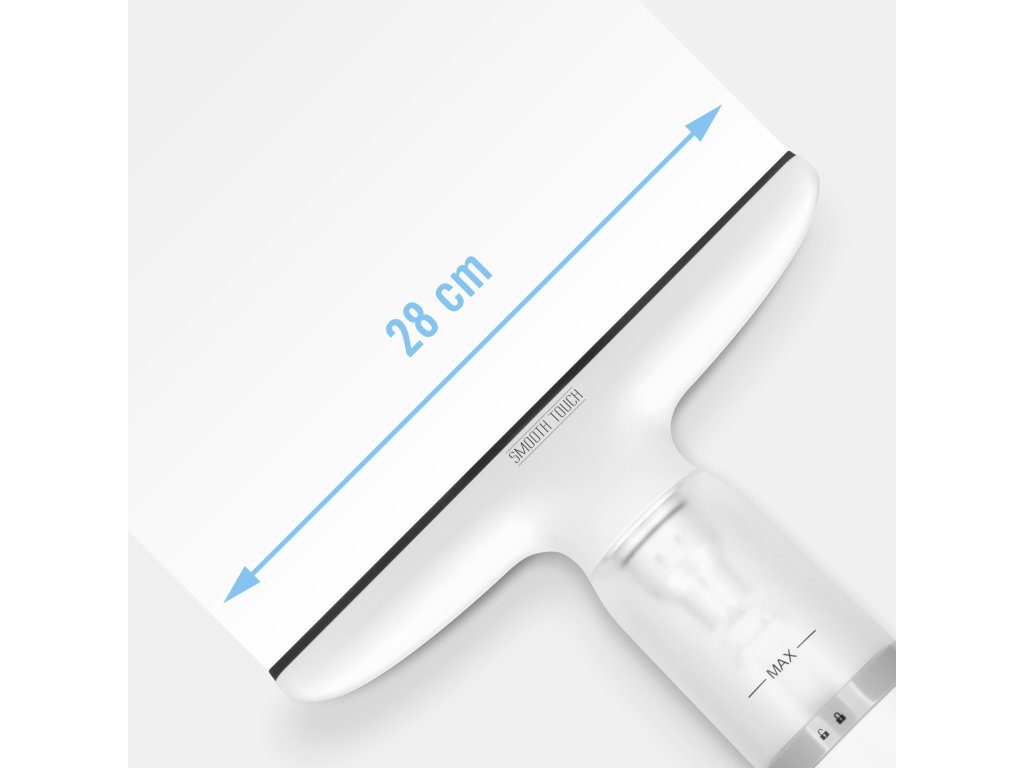 Pod pretpostavkom da vaši prozori imaju standardne dimenzije 146 x 143 cm, potrebno je samo 5 poteza čistačem prozora SMOOTH TOUCH kako biste postigli efekt čistog, sjajnog stakla. Mlin s širinom od 28 cm odmah usisava prljavu vodu izravno u ugrađeni spremnik, što čišćenje prozora čini brzim i ugodnim.