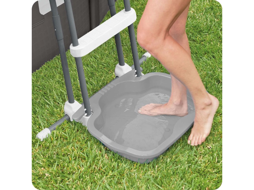 Svaki vlasnik vrtnog bazena trudi se održati što čišću vodu – kupanje u takvim uvjetima je ugodno i opuštajuće, za razliku od brčkanja u društvu listova ili zrna pijeska. Problem rješava pješčana pumpa koja skuplja razne sitne nečistoće. U skladu s načelom da je bolje spriječiti nego ispravljati posljedice, Intex je pripremio čistač za noge. Njegov princip rada je vrlo jednostavan – služi kao otirač za osobu koja ulazi u vrtni bazen. Zahvaljujući tome, sve nečistoće zalijepljene za noge ostaju na sivoj plitici i ne prenose se u vodu.