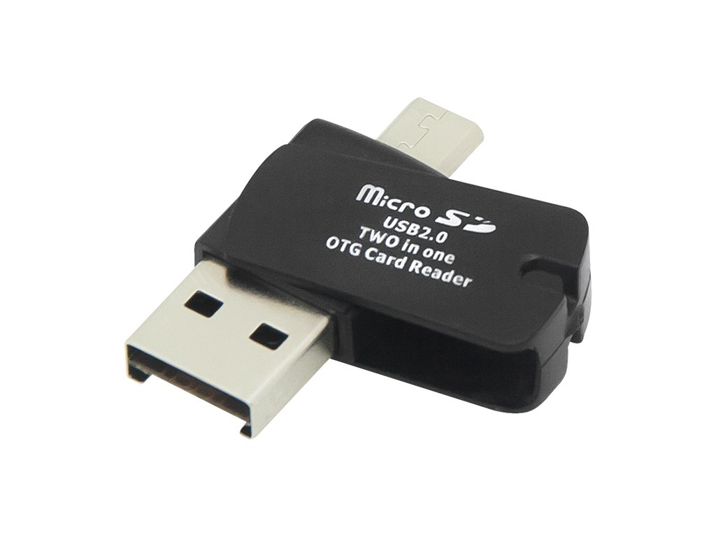 Niewielkich wymiarów czytnik kart pamięci microSD z dwoma wtykami - USB-A oraz microUSB. Kartę należy umieścić w przeznaczonym gnieździe, a następnie podłączyć czytnik do urządzenia typu komputer, laptop, tablet itp. aby odczytać zapisane dane na karcie microSD - pliki, zdjęcia, filmy, dokumenty i inne.