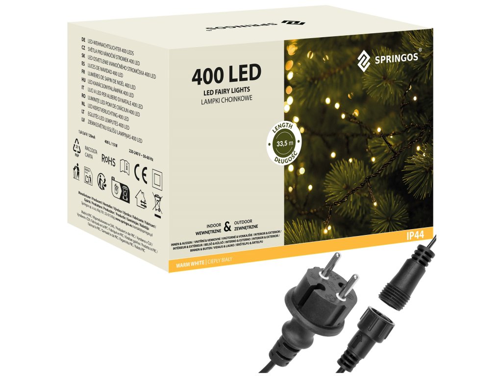 Marka: Springos Svjetlo: stalno Boja: toplo bijela Broj dioda: 400 led Ukupna duljina: 25,5 m Duljina dijela s led diodama: 24 m Tip konektora: hermetički Diodi: vodootporni, energetski učinkoviti Kablovi: bakreni, otporni na kidanje Izgaranje 1 diode ne isključuje set Boja izolacije: tamnozelena Debljina izolacije: 1,5 mm Napajanje: 220-240V Snaga: 12,8 W Certifikati: CE, RoHS Razred zaštite: IP44 (za vanjsku uporabu) Udaljenost između dioda: 6 cm Mogućnost spajanja do 3 komada svjetlosnih lanacaAdditional parameters