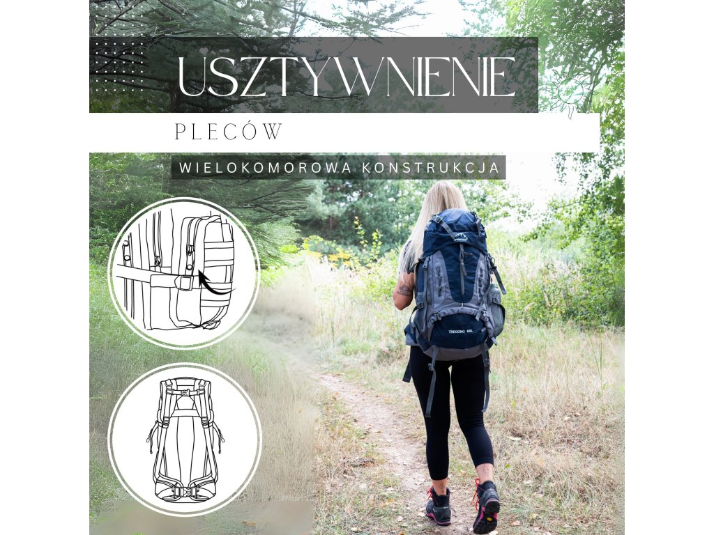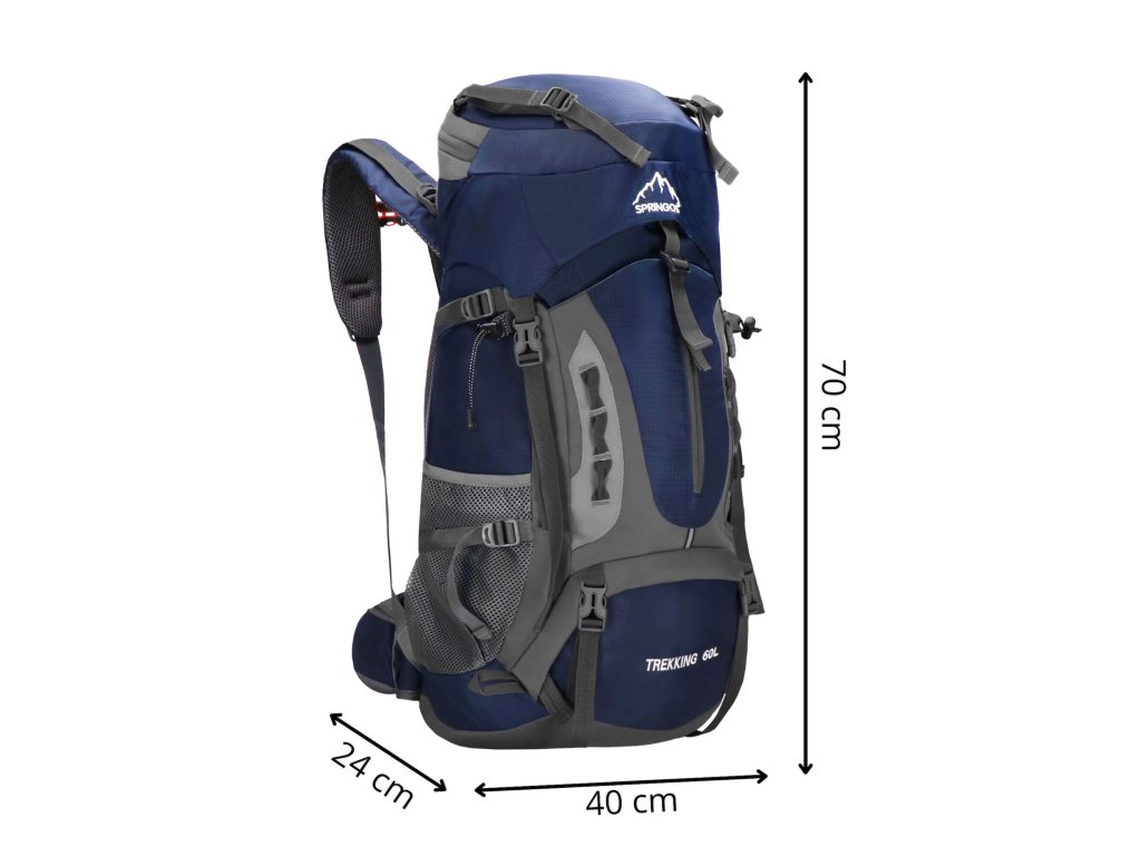 - Na gornjem dijelu s prednje strane preklopa izvezen je bijeli logo Springos, na donjoj strani natpis TREKKING 60L.
