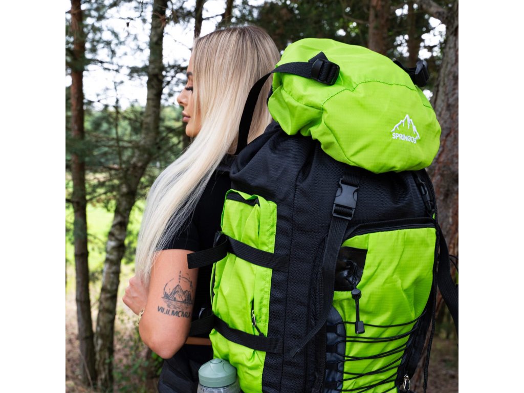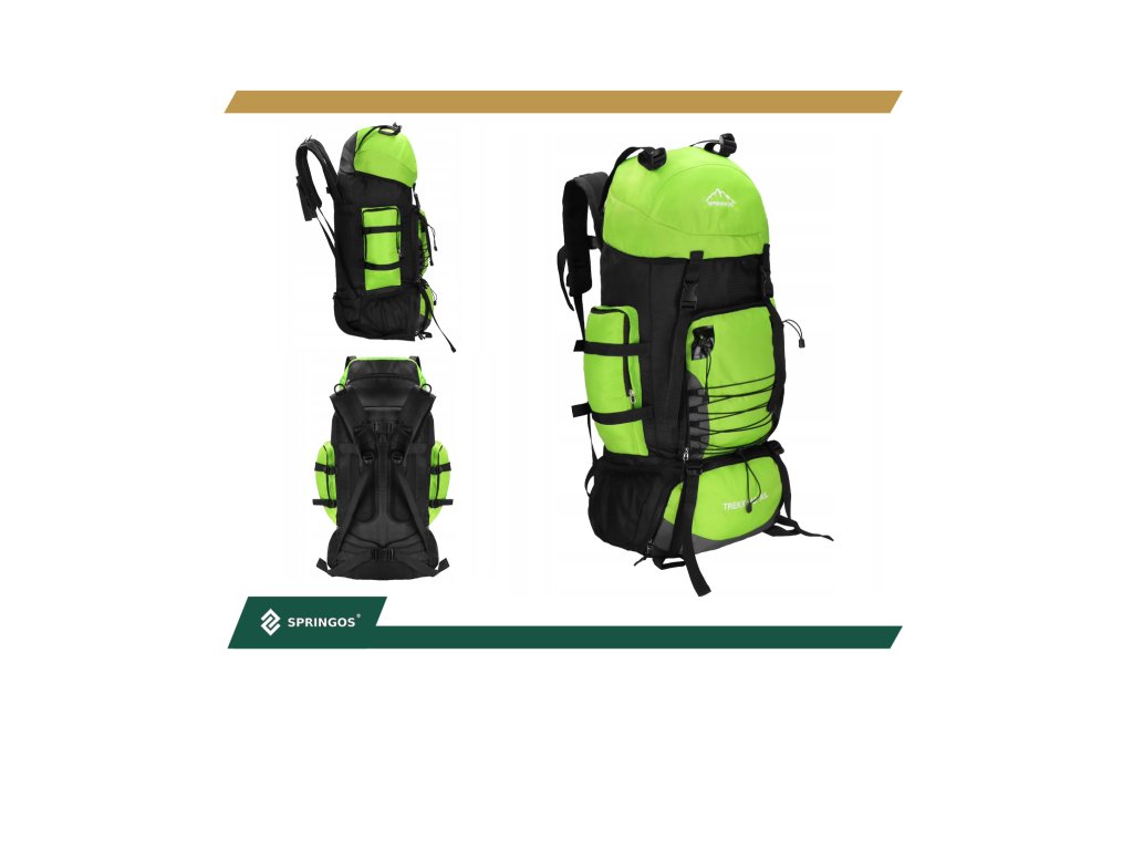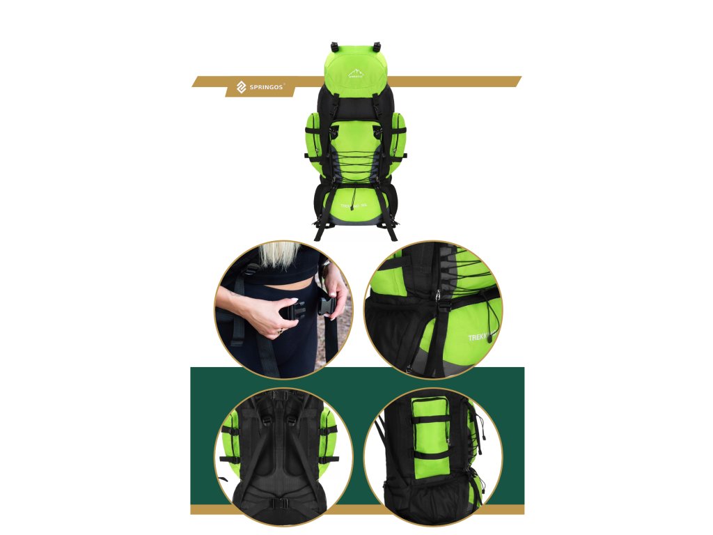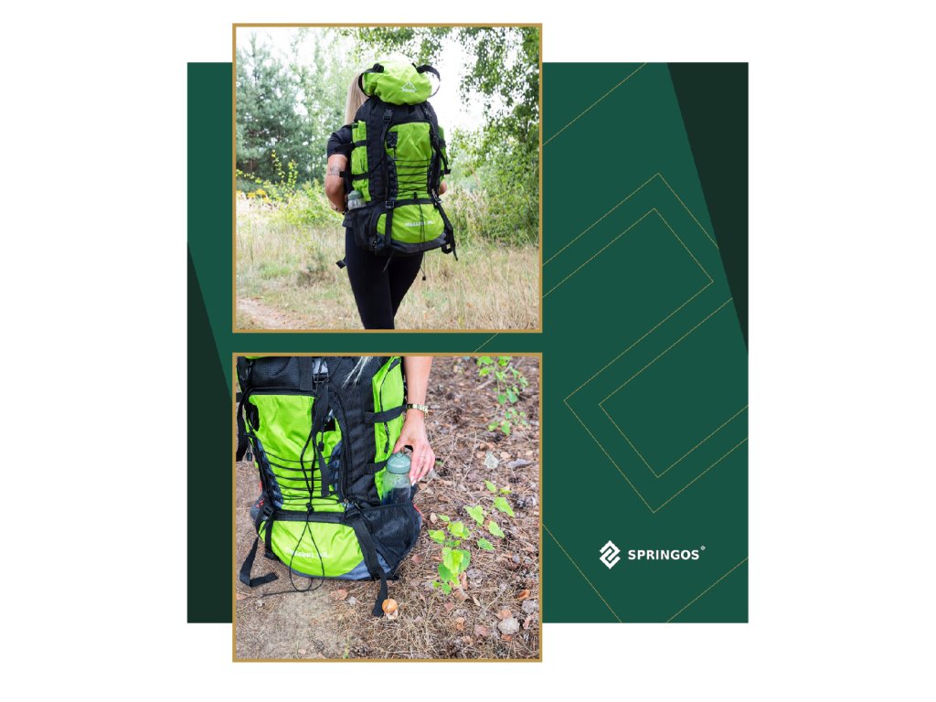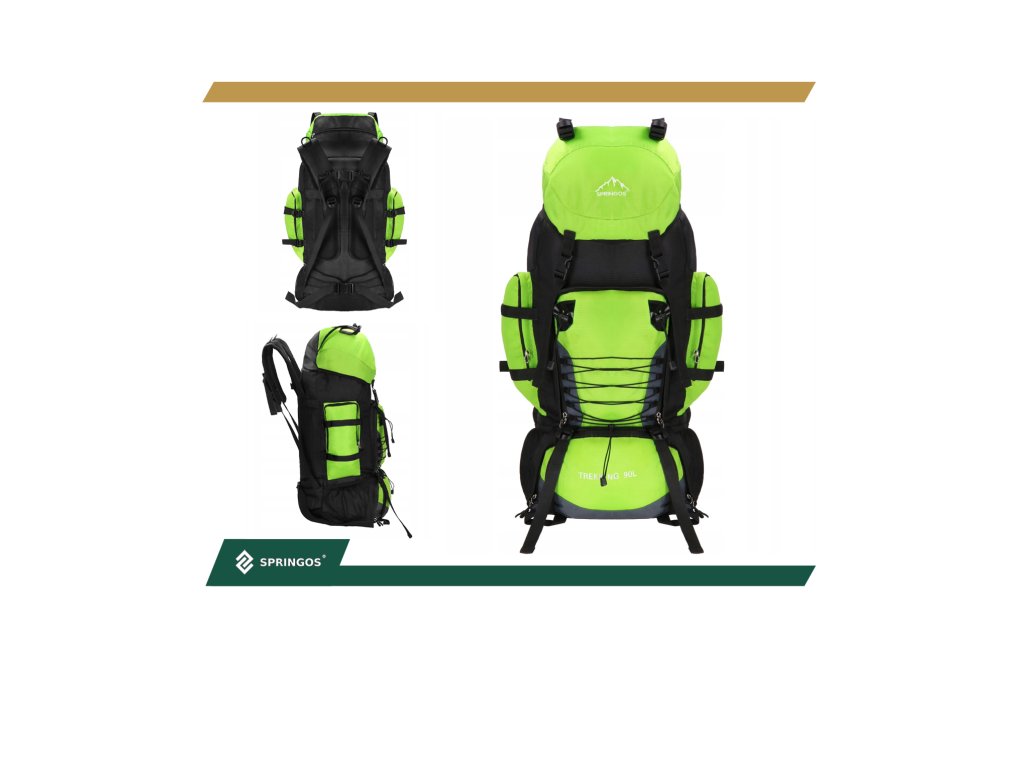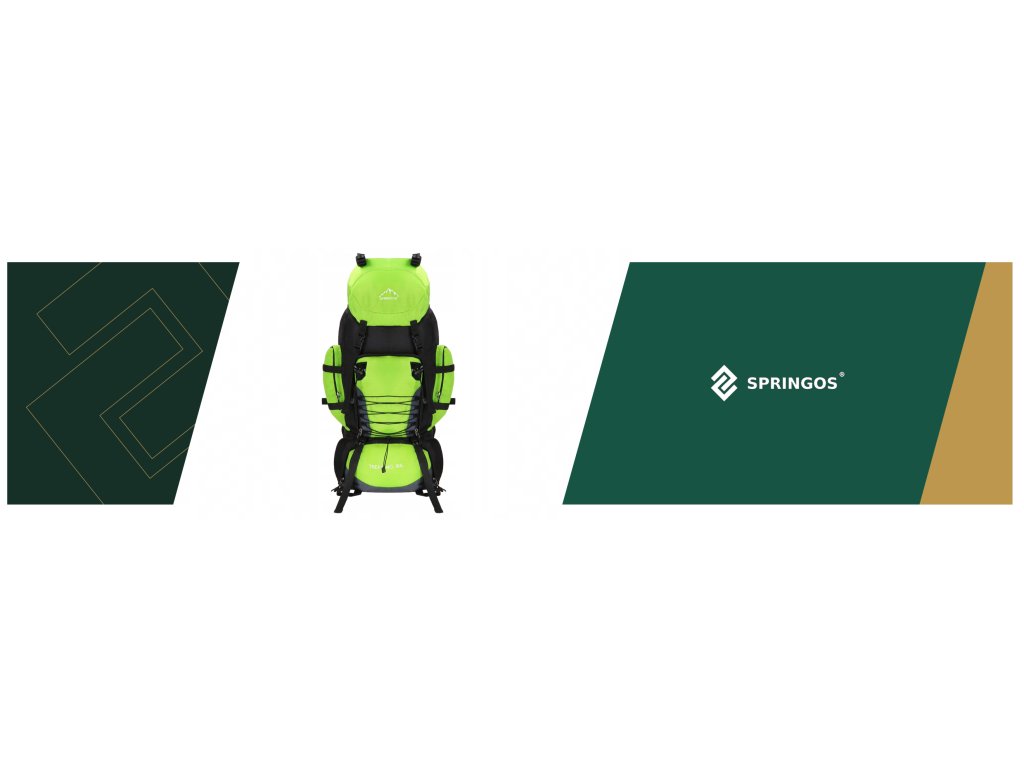 - Na gornjem dijelu sprijeda poklopca izvezeno bijeli logo Springos, na donjem dijelu naziv TREKKING 90L.