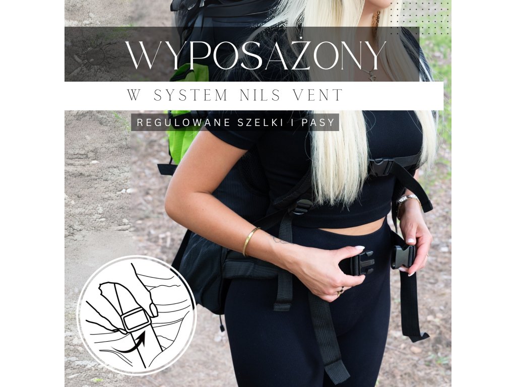 - Ukupna dužina pojasne trake: MIN 36 cm + širina stražnjeg dijela ruksaka: 34 cm -> obod min. 70 cm; MAX 118 cm -> obod max: 188 cm