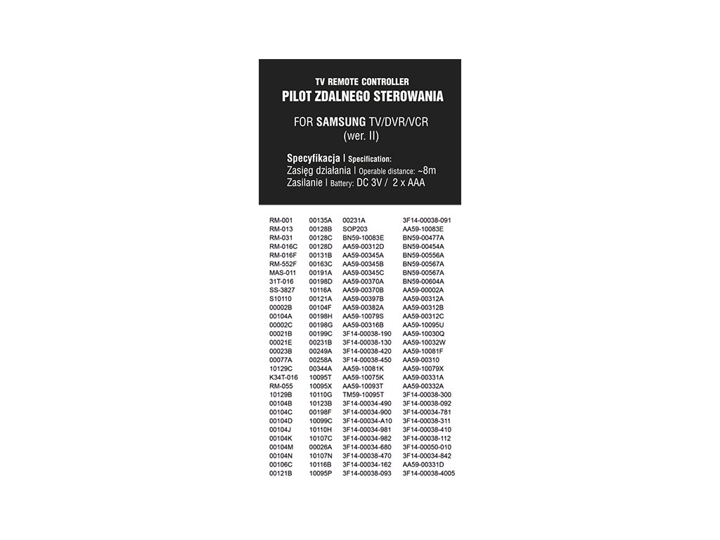 Namjena: uređaji marke SAMSUNG: TV, videorekorder, DVROperativni domet: 8 mNapajanje: 2 x AAA baterije (baterije nisu uključene u paket)Univerzalni daljinski upravljač za upravljanje sljedećim uređajima marke SAMSUNG: TV, videorekorder, DVR. Proizvod ima potrebne gumbe za osnovno upravljanje ovim uređajima. Jednostavan dizajn i raspored omogućuju potpuno lako i intuitivno upravljanje. Za izradu daljinskog upravljača korišteni su visokokvalitetni materijali koji osiguravaju dug vijek trajanja proizvoda. Idealan je za upravljanje uređajem u slučaju gubitka ili oštećenja tvorničkog daljinskog upravljača.Najvažnije funkcije: