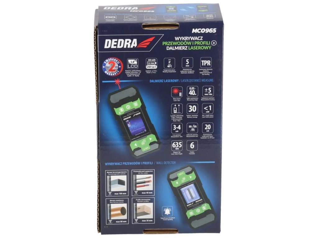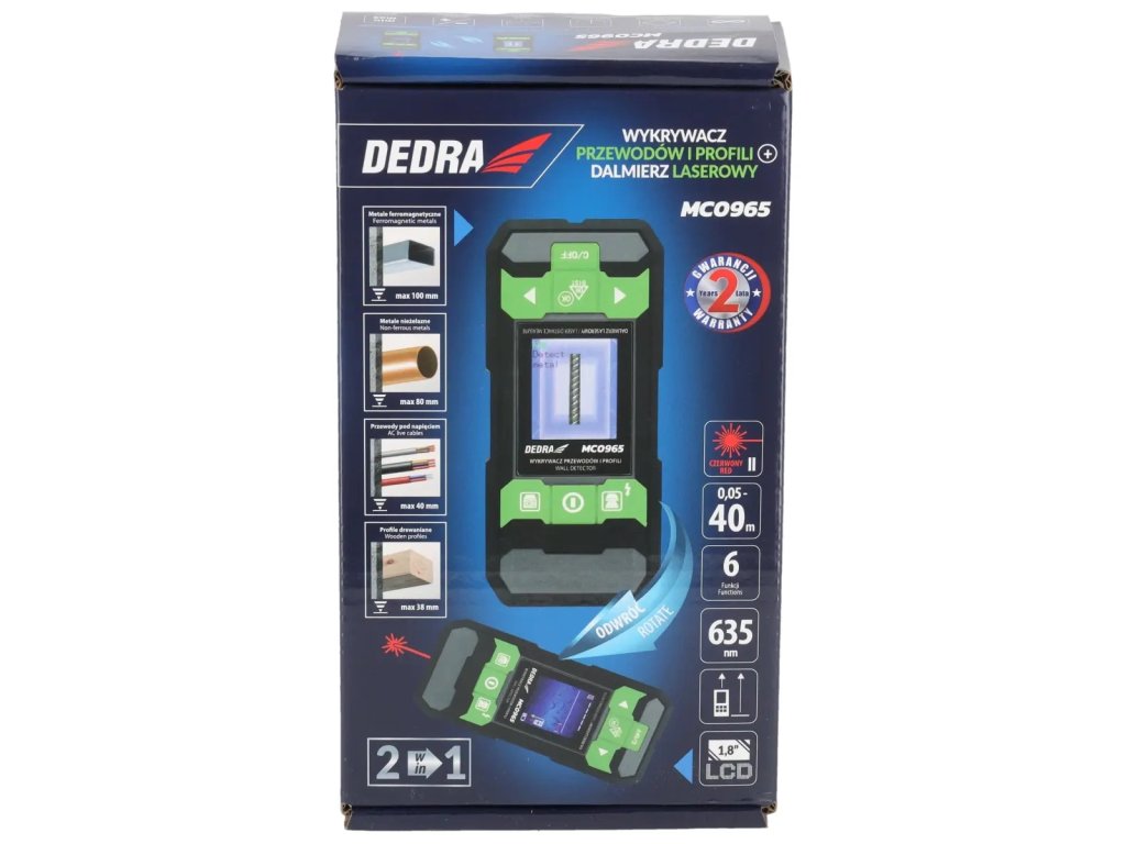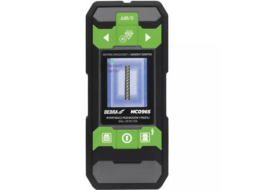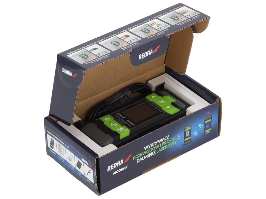 Detektor žica i kabela DEDRA MC0965 omogućuje detekciju metalnih dijelova i žica, električnih kabela bez i pod izmjeničnim naponom te drveta, kao i drugih predmeta, poput željeza, betona, stakla, aluminijuma itd. Pomaže to dovršiti tehničku dokumentaciju zgrada. Osim toga, detektor je opremljen funkcijom mjerača udaljenosti s radnim rasponom 0,05-40 m, što je velika prednost jer umjesto dva uređaja imamo jedan.