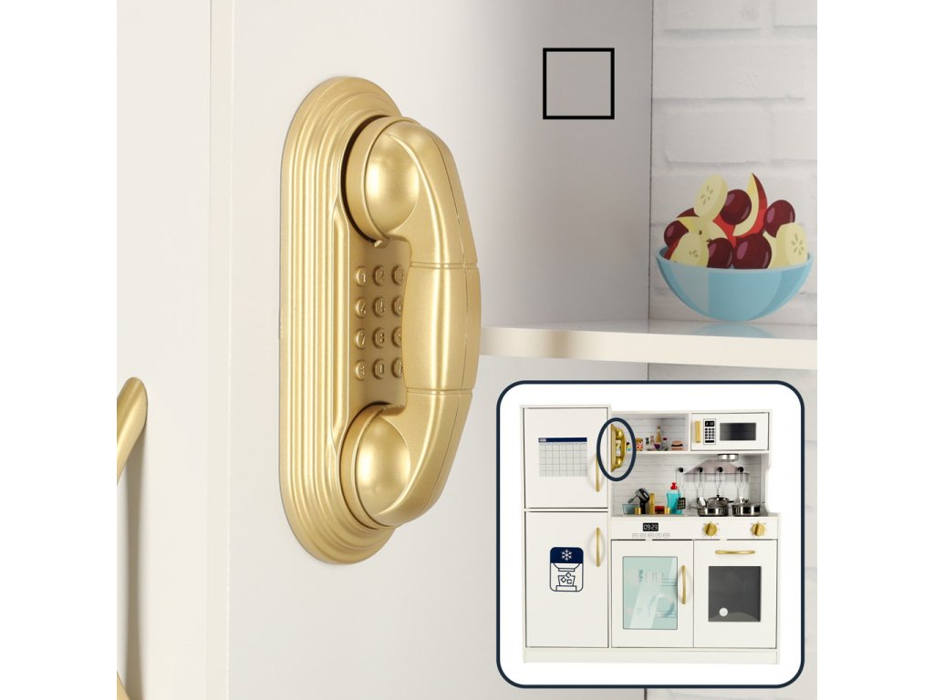 Biela farba kuchynky so zlatými prvkami dokonale zapadne do každej detskej izby a poskytne nielen priestor na hranie, ale aj výraznú dekoráciu.
