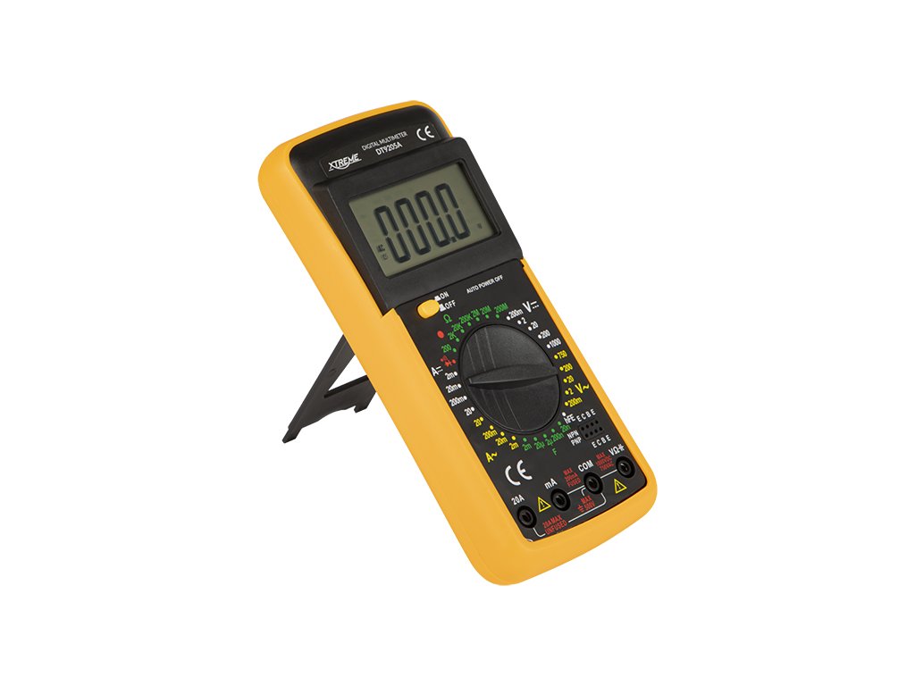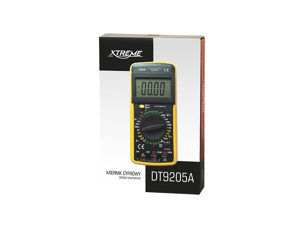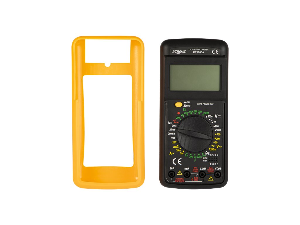 Specifikacija:Jednosmjerna voltaža: 200mV/2V/20V/200V/1000V ±(0.8%+5)Naizmjenična voltaža: 200mV/2V/20V/200V/750V ±(1.0%+5)Jednosmjerna struja: 20µA/200µA/2000µA/20mA/200mA/2A/20A ±(2.0%+2)Naizmjenična struja: 20µA/200µA/2mA/20mA/200mA/2A/20A ±(2,0%+3)Otpor: 200Ω/2kΩ/20kΩ/200kΩ/2MΩ/20MΩ/200MΩ ±(1,0%+4)Kapacitet: 2nF/20nF/200nF/2uF/20uF/200uF +/-(4%+5)hFe testiranje tranzistora: DAAkustični tester provodljivosti: DATestiranje dioda: DALCD prikaz: podesivNapajanje: 9V baterijaFrekvencija uzorkovanja: 2 puta u sekundiMetoda mjerenja: dvostruki integrirani A/D konverter Indikacija preopterećenja: na zaslonu samo brojka "1"Radna temperatura: 0-40 stupnjeva CelzijusaTemperatura skladištenja: -10-50 stupnjeva CelzijusaIndikacija niske baterije: ikona baterije na zaslonuDimenzije proizvoda: 190x90x33 mmTežina proizvoda: 227 gIsporuka uključuje: mjerač, baterije, potrebni kablovi Glavne funkcije:Podesiv LCD zaslonRotacioni prekidač za odabir specifične funkcije, raspona i uključivanje/isključivanje mjeračaMjerni kablovi su uključeniNapajanje 9V DC baterijomIndikacija prazne baterijeIndikacija preopterećenjaOpna od gume koja se može ukloniti Metar XTREME je univerzalan alat namijenjen za radionice ili škole, ali je također izvrsno prikladan za kućne i profesionalne zadatke. Opremljen je vrlo preglednim LCD zaslonom s podesivim i kosim prikazom, zaštitnim i uklonjivim gumiranim poklopcem, a na stražnjoj strani je ugrađen oslonac koji olakšava čitanje rezultata tijekom mjerenja. Također uključuje potrebne kablove.Dodatni parametri