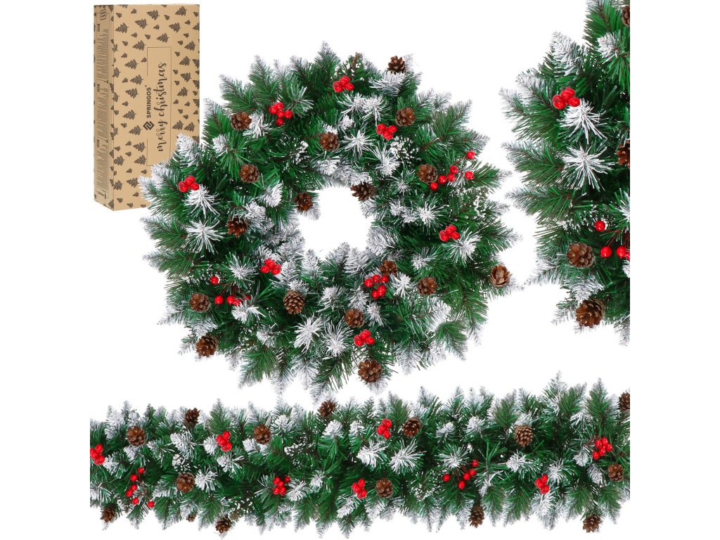 - Girlanda ima umjetne crnogorične grančice s PVC iglicama i ukrase: prirodni češeri i umjetne bobice