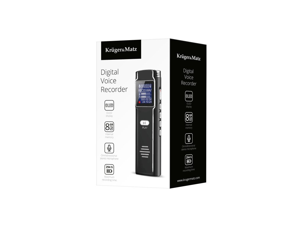 Diktafon Kruger&Matz KM0286 ima 8 GB interne memorije. Za pohranu memorije uređaja možete koristiti funkciju aktivacije glasa VAR. U ovom načinu rada uređaj će snimati samo kada prepozna zvuk, a ako je zvuk previše tih, automatski će se isključiti. Posebno korisna je i funkcija smanjenja šuma, koja blokira okolne zvukove. Još uvijek niste uvjereni To je tek početak prednosti diktafona Kruger&Matz. Osim toga, uređaj uključuje nekoliko načina reprodukcije uključujući način ponavljanja A-B, koji omogućuje odabir dijela snimke koji će se ponavljati 5 puta, kao i podesivu brzinu reprodukcije.