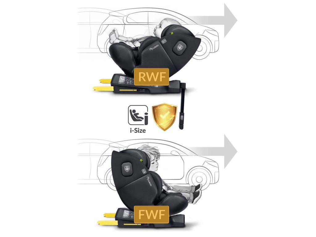 - montaža u položaju suprotnom od smjera vožnje (RWF) namijenjena za djecu visine 40-105 cm (odgovara dobi od rođenja do cca 4 godine),