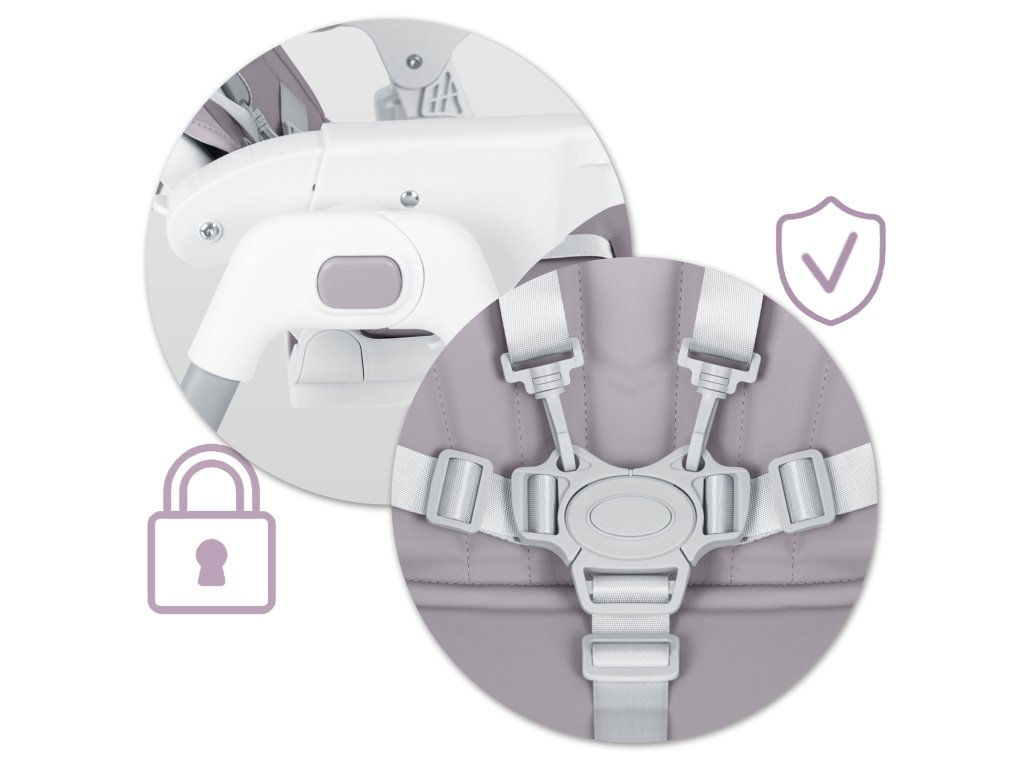 Pouzdani i provjereni pet točkovni sigurnosni pojasevi osiguravaju da dijete neće moći samostalno napustiti stolicu i riskirati pad.
