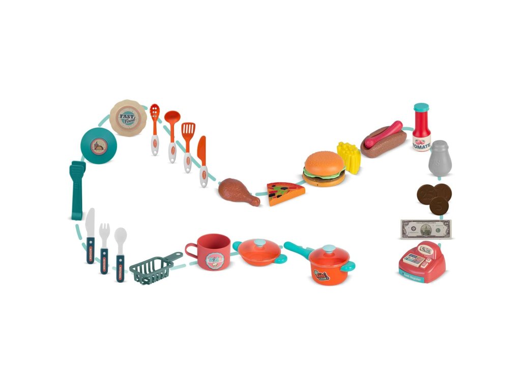 - pribor i hrana vidljivi na slici dio su kompleta (na kutiji nije vidljiva pregača i kuhinjska kapa),