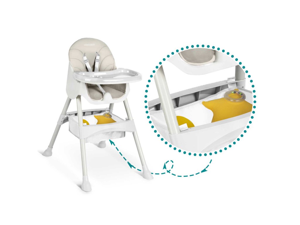 Stolčić omogućuje slobodno podešavanje udaljenosti pladnja od djeteta. Možete ga također u potpunosti demontirati u bilo kojem trenutku.