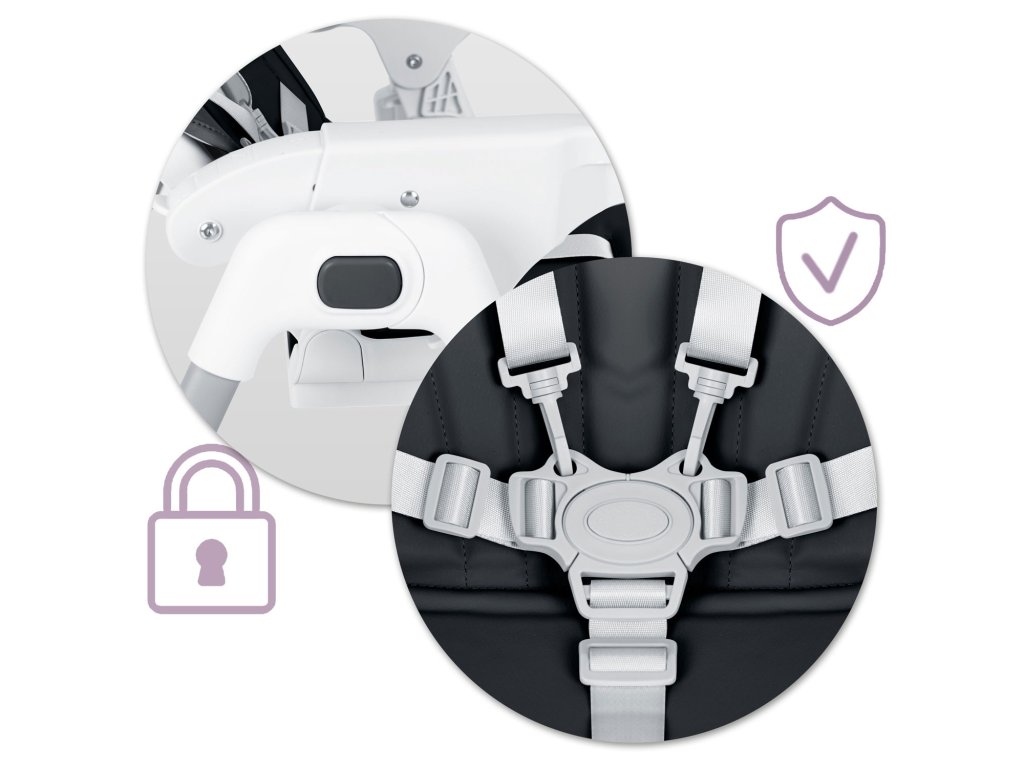 Pouzdani i provjereni pet točkovni sigurnosni pojasevi osiguravaju da dijete neće samo napustiti stolicu i riskirati pad.