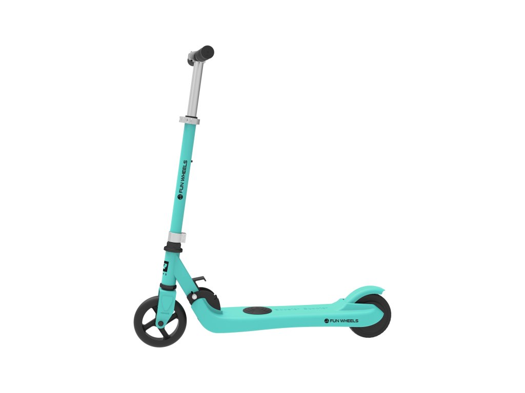 Dječji električni skuter Fun Wheels ima u platformi ugrađen nožni pogon, ali za razliku od tradicionalnih modela električnih skutera, ovo vozilo se pokreće tek nakon odgurivanja. To značajno povećava sigurnost i udobnost tijekom vožnje.