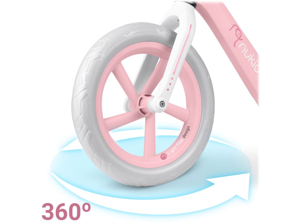 - Jednostavnije skretanje: kotači koji rotiraju 360 stupnjeva omogućuju djetetu brzo i precizno skretanje u bilo kojem smjeru, bez potrebe za podizanjem prednjeg kotača ili izvođenjem većih tjelesnih pokreta.