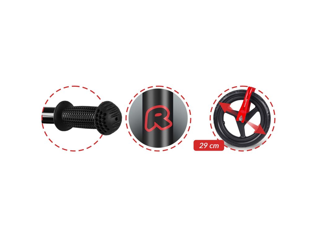 - Stražnja kočnica: omogućuje djetetu učinkovito i sigurno zaustavljanje. Jednostavna konstrukcija osigurava jednostavno rukovanje i povećava kontrolu tijekom vožnje.