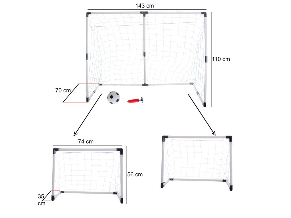 Veliki gol ima dimenzije 143 cm x 110 cm x 70 cm, dok jedan manji gol ima dimenzije 74 cm x 55 cm x 35 cm.