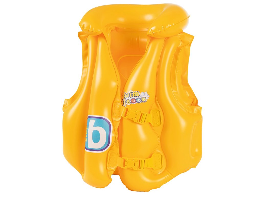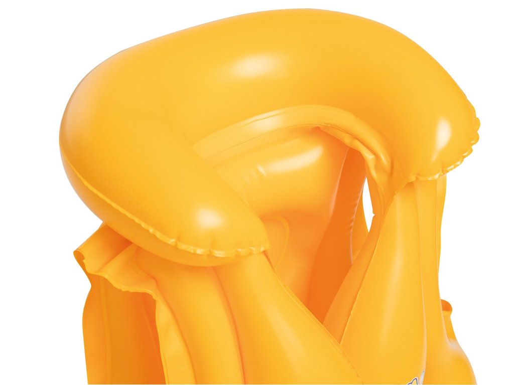 Prsluk dimenzija 51 cm x 46 cm, uz pomoć odrasle osobe, pruža malim plivačima potpunu sigurnost. Tri neovisne zračne komore održavaju dijete na površini, a napuhani ovratnik sprječava da se glava zagnjuri u vodu. Prsluk je pričvršćen s dva podesiva kopčanja, tako da dijete samo ne ispadne. Osim toga, žuta boja omogućava brzi pronalazak vašeg djeteta u gomili posjetitelja plaže.